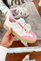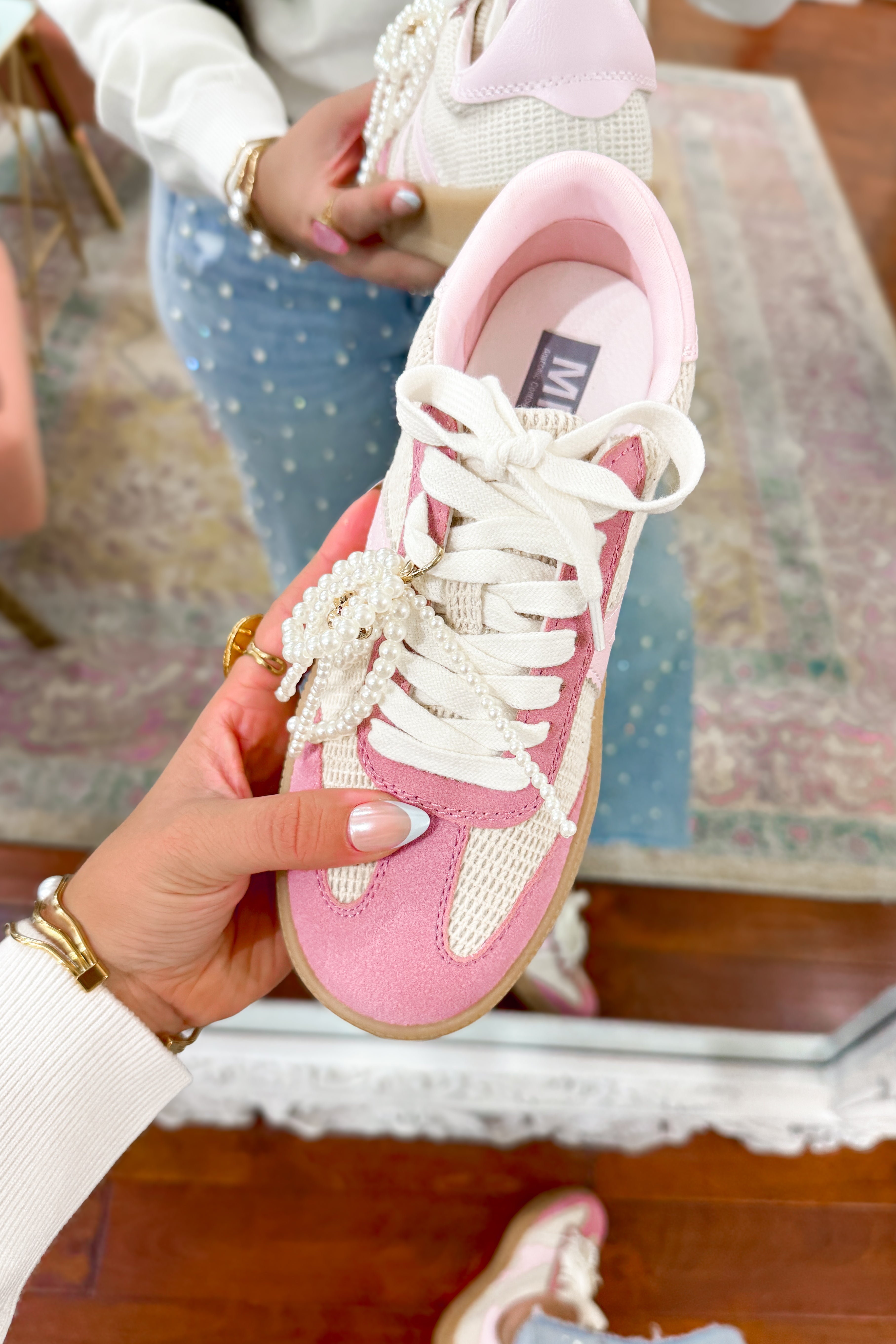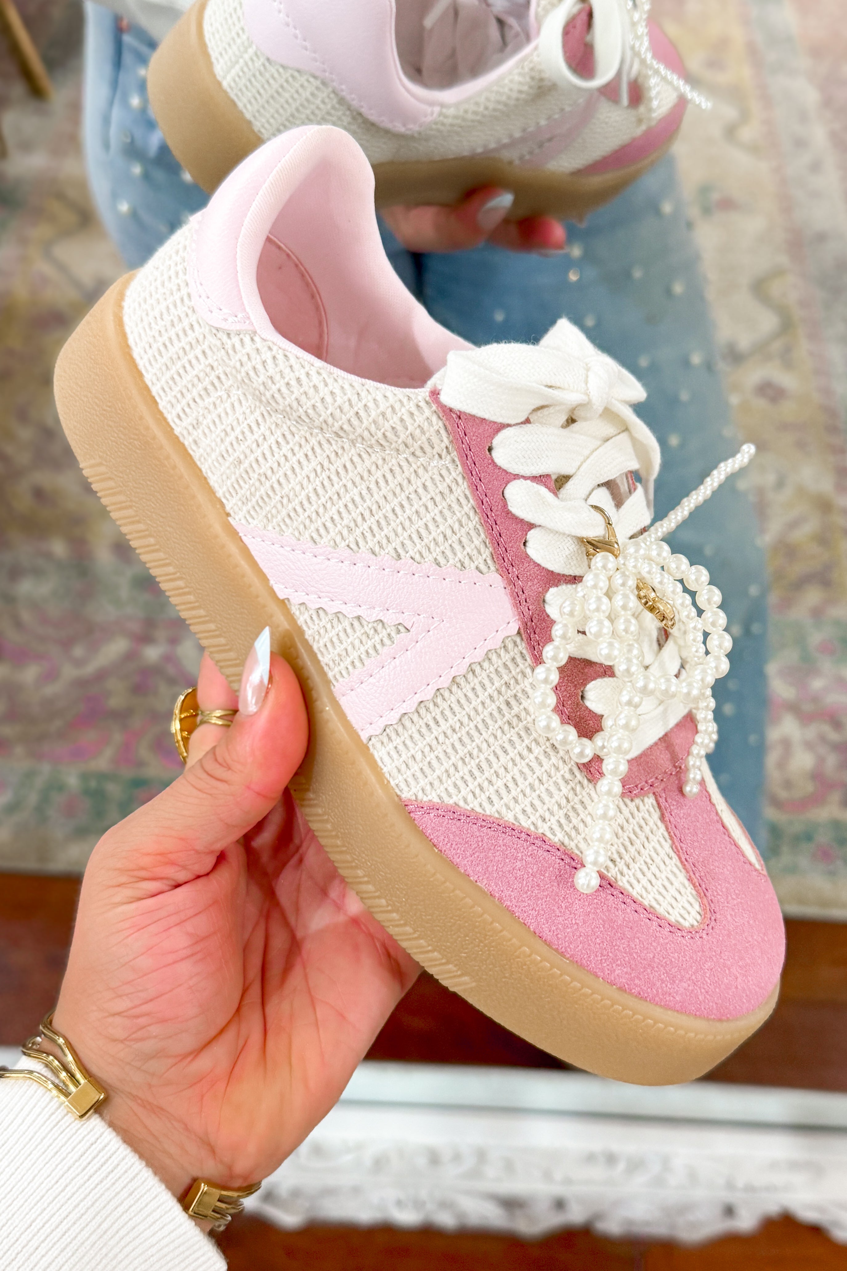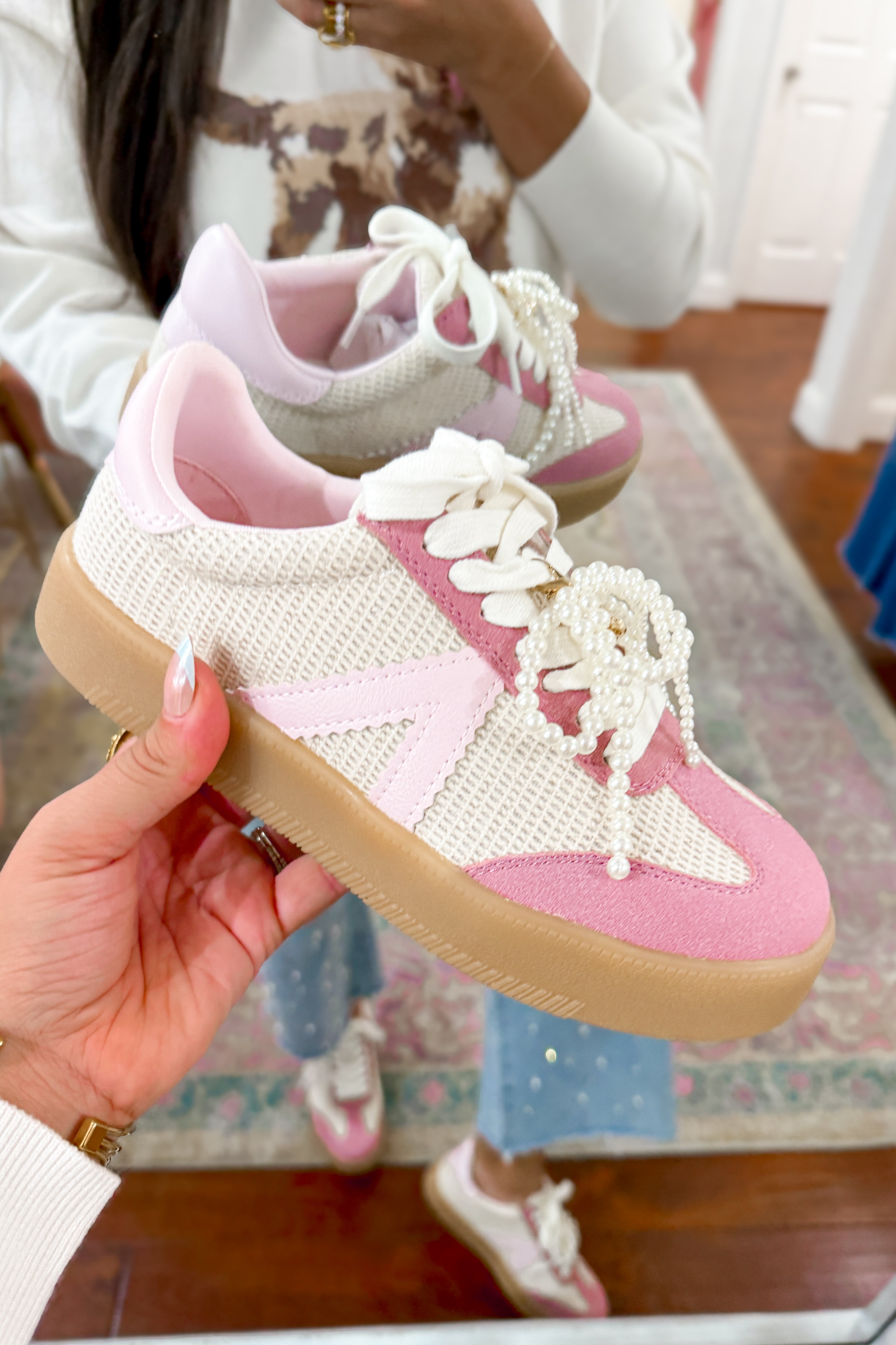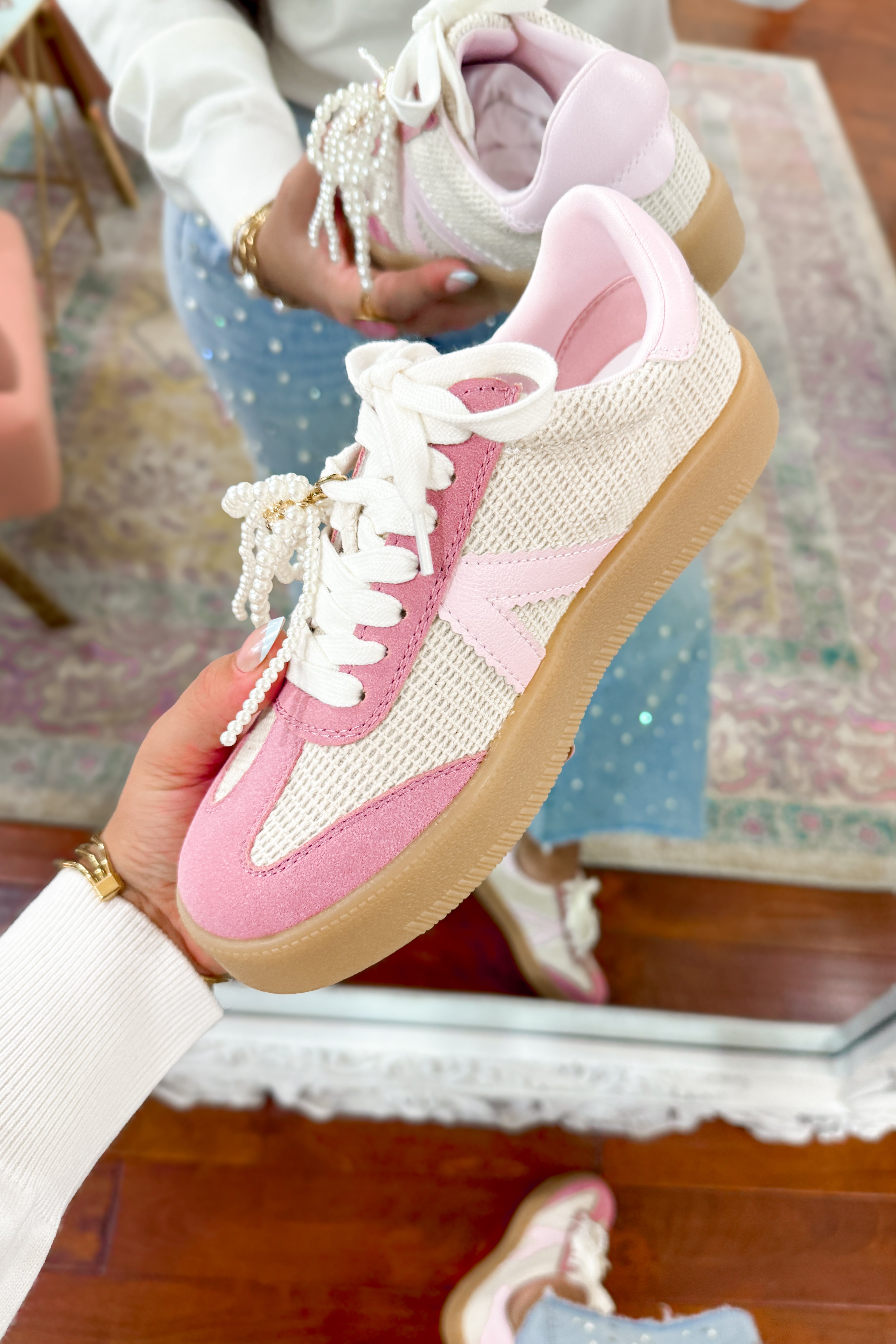 - The sweetest pink-and-cream sneakers with a woven texture, soft suede contrast, and a standout pearl lace charm that adds the perfect girly touch. Comfy, lightweight, and easy to style for everyday wear. A fun, feminine sneaker that instantly elevates any outfit.
