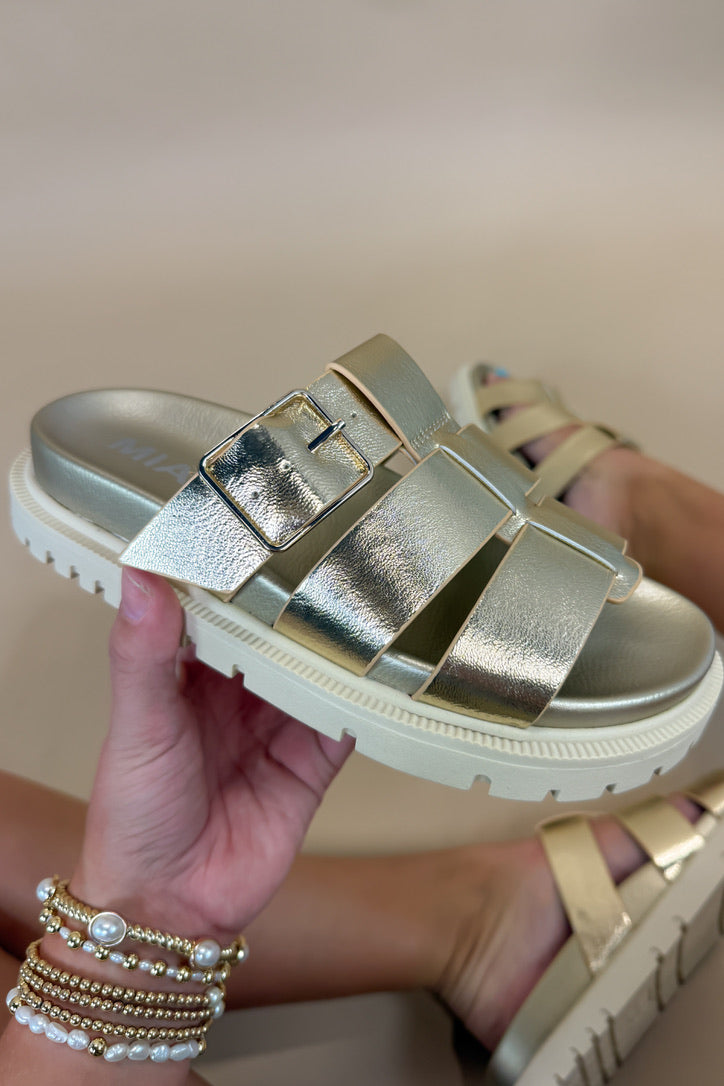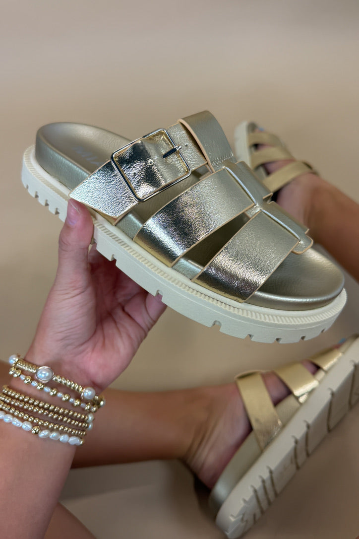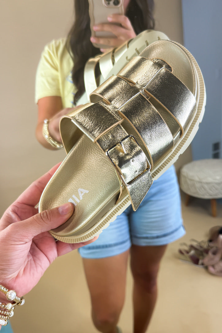 - Say hello to your new go-to summer sandal — The Goldie Luxe Slide. These metallic gold slides feature chunky double buckles, a grippy lug sole, and cushioned footbed that blends comfort with elevated everyday style. The shiny gold finish adds a glam touch, perfect for dressing up casual denim or complementing your favorite sundress. Whether you're running errands or heading to brunch, these sandals will keep you stylish and supported.