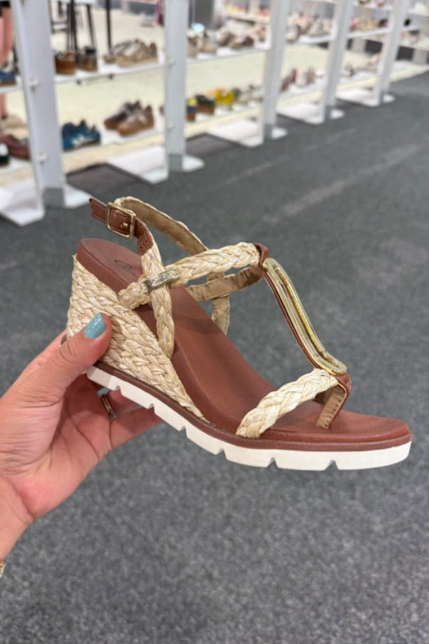 - Step into effortless style with The Soleil Braided Wedge Sandal. Featuring braided jute straps with gold hardware accents, a comfortable platform wedge, and a secure ankle buckle, these sandals are the perfect blend of casual chic and elevated detail. The sporty outsole gives extra comfort and grip, making them ideal for all-day wear — whether you're strolling the city, brunching with friends, or heading out for a weekend getaway.