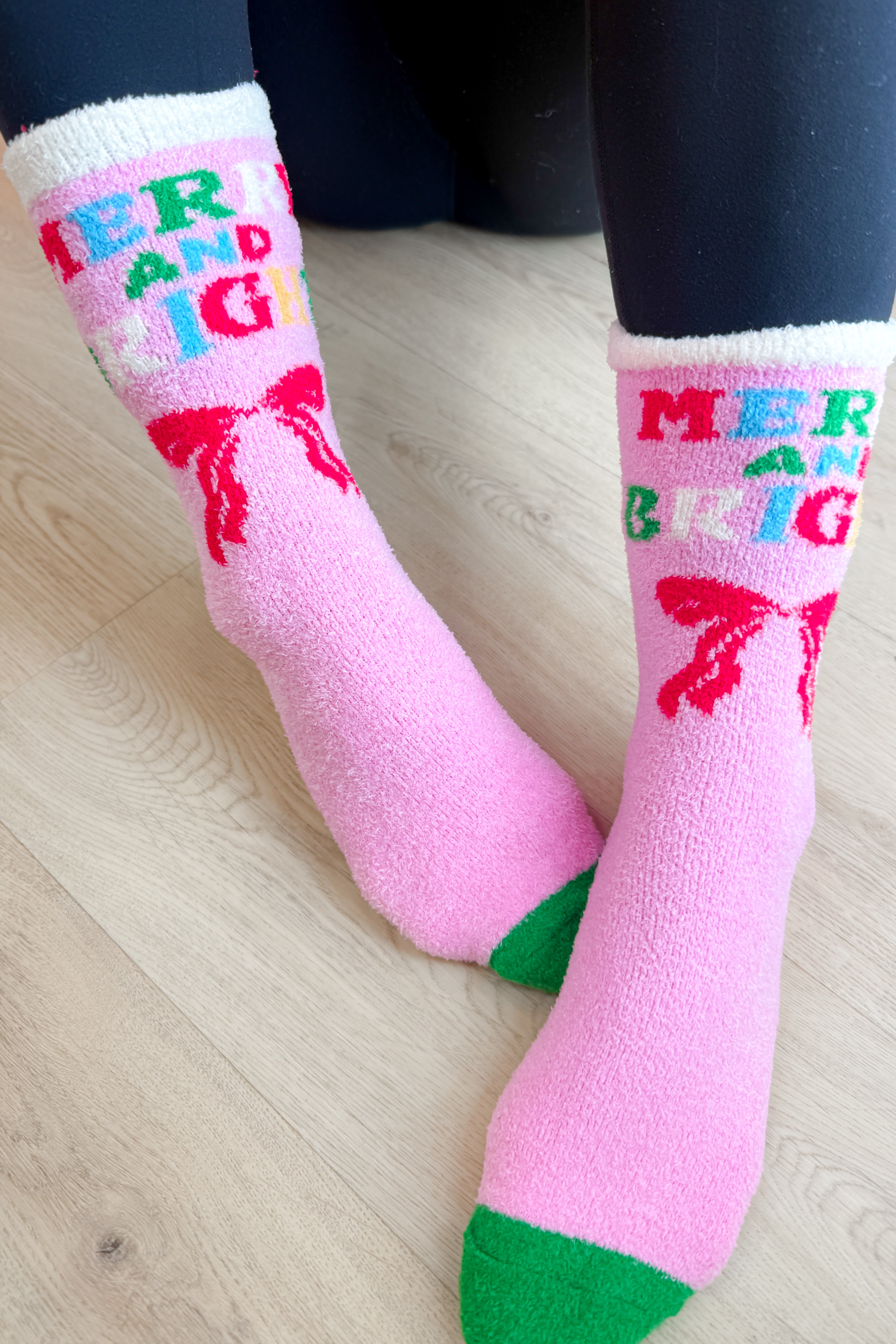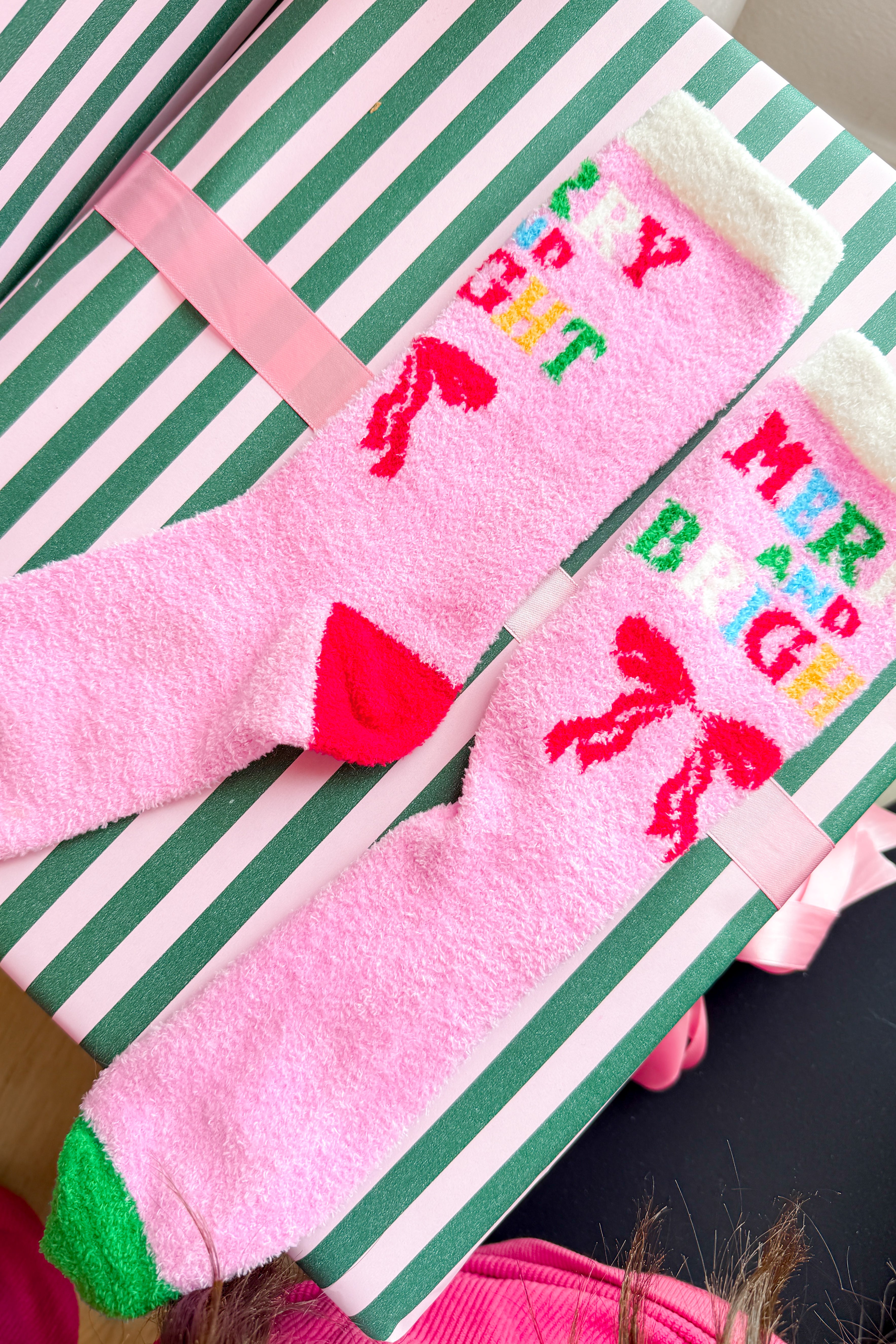 • Spread some serious cheer from head to toe with our "Merry & Bright" Socks. These cozy pink socks are decked out with festive red bows and a colorful “Merry and Bright” message across the top.