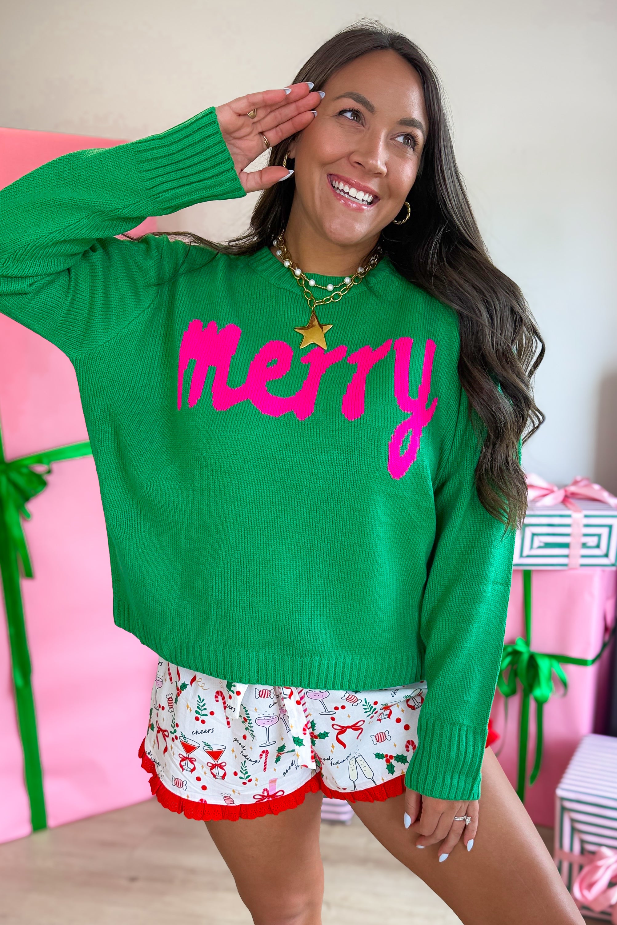 - Bring festive cheer to your wardrobe with this cozy knit sweater featuring a bold “Merry” graphic. Designed for comfort and style, it’s the perfect pullover for holiday gatherings, casual outings, or lounging fireside.