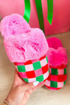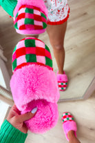 - Slide into the coziest vibes with these festive Checkered Slippers, featuring a bright pink cuff and a cheerful red, green, and pink plaid design.