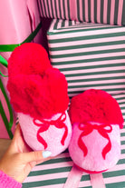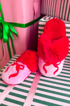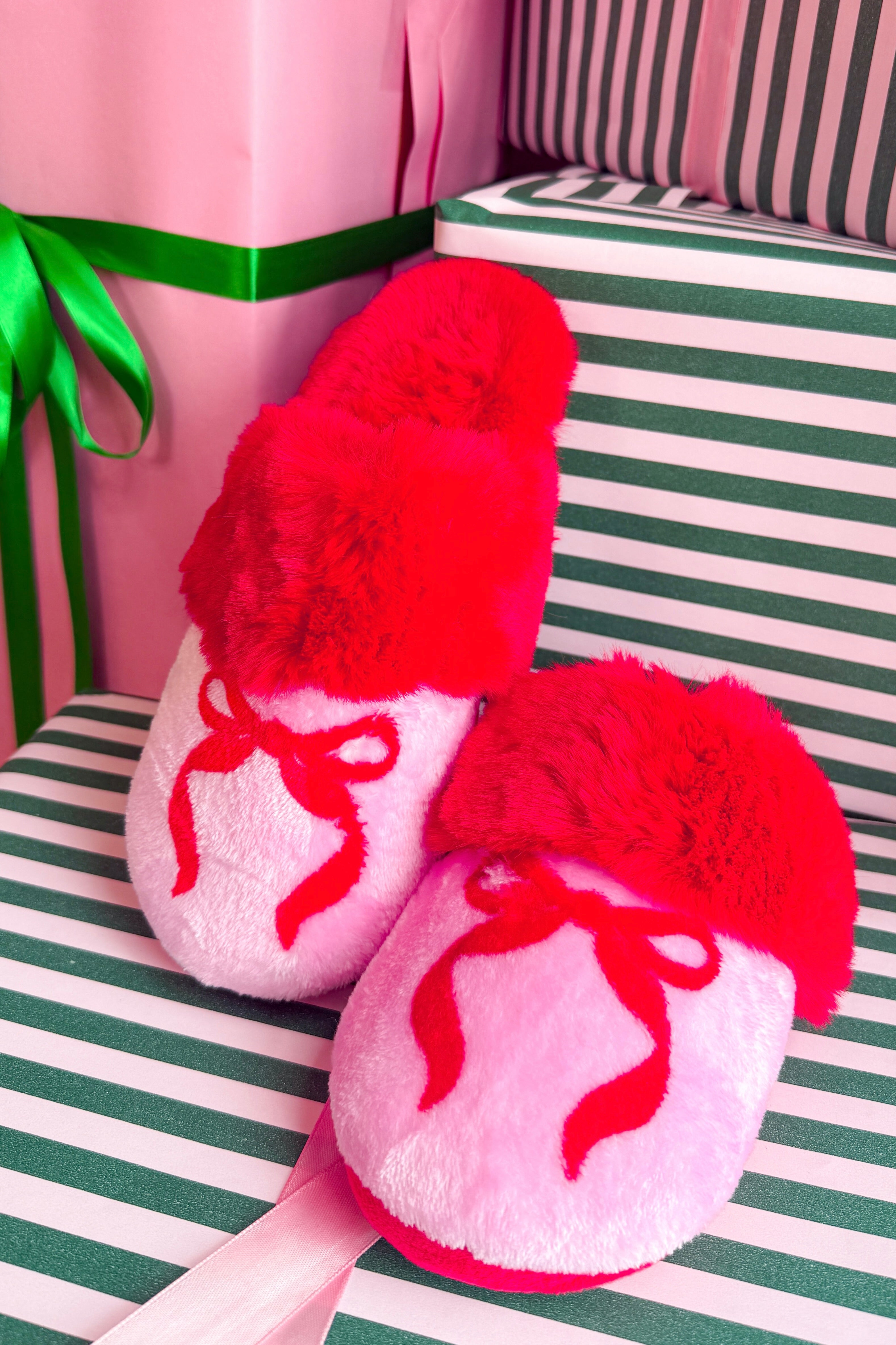 - Stay cozy and cute all season long in The Merry Bow Slippers. Featuring a soft pink base with plush red faux fur and bow detailing, these slippers are the ultimate holiday treat for your feet.