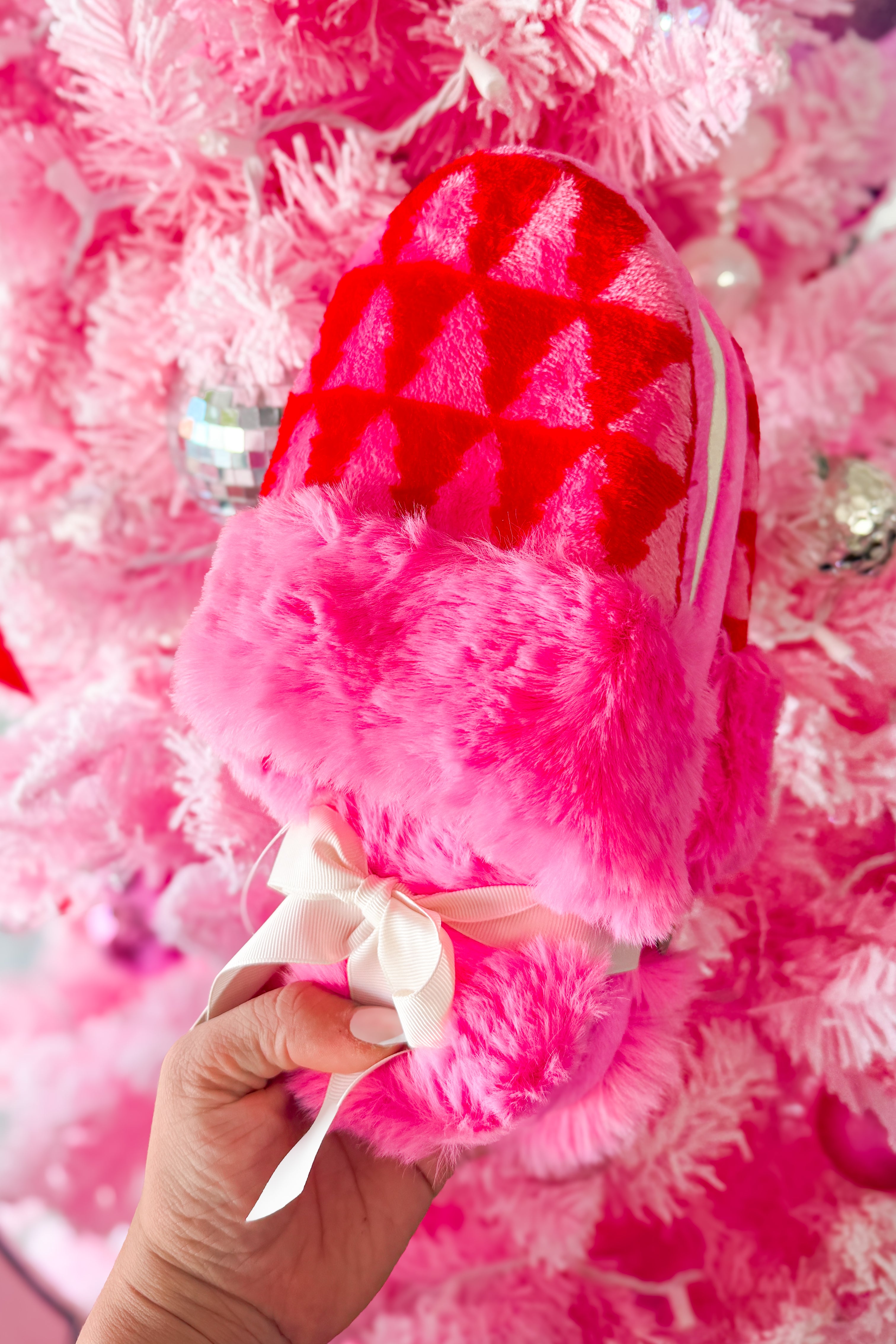 - Stay cozy and cute all season long in The Merry Bow Slippers. Featuring a soft pink base with plush red faux fur and bow detailing, these slippers are the ultimate holiday treat for your feet.
