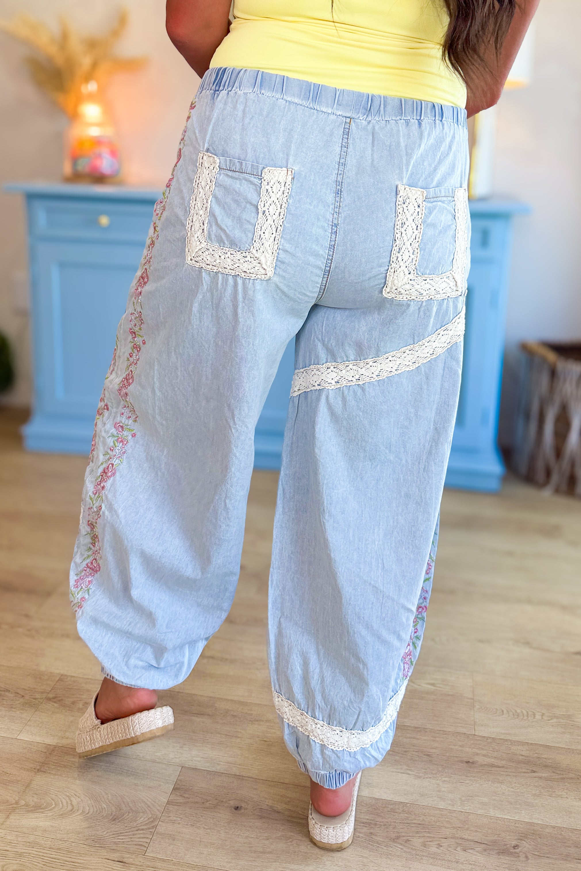 - Step into your soft-girl era with these dreamy wide-leg joggers feature light-wash denim with delicate lace trim, whimsical floral embroidery down the sides, and exaggerated patchwork details that feel equal parts boho and statement. The stretchy waistband and adjustable lace tie make them comfy for all-day wear, while the gathered ankles keep the fit playful and relaxed.