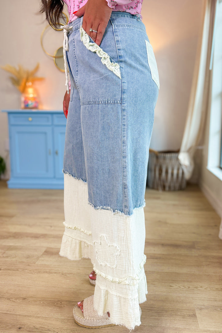 Dreamy Denim Ruffle Patchwork Pants