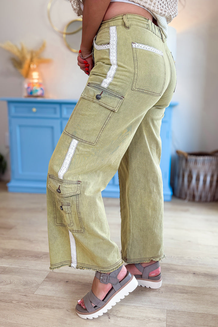 • The Margot Olive Lace + Cargo Trousers bring soft, feminine detail to a rugged silhouette. Crafted in a rich olive hue with utility-style pockets and lace trim down the sides, these wide-leg pants strike the perfect balance between vintage charm and modern edge.