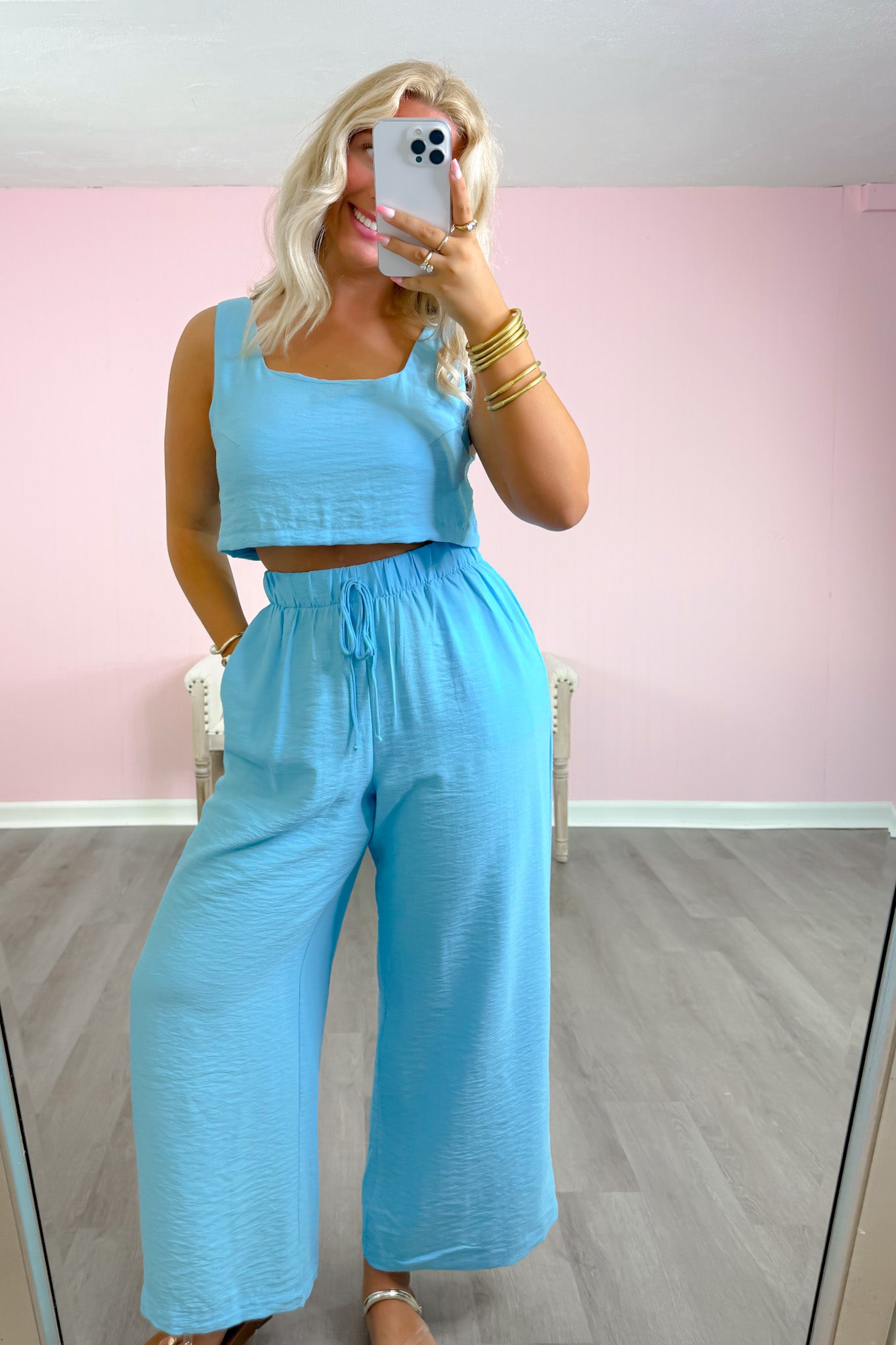 • Flowy wide leg pants in a stunning Caribbean blue shade.