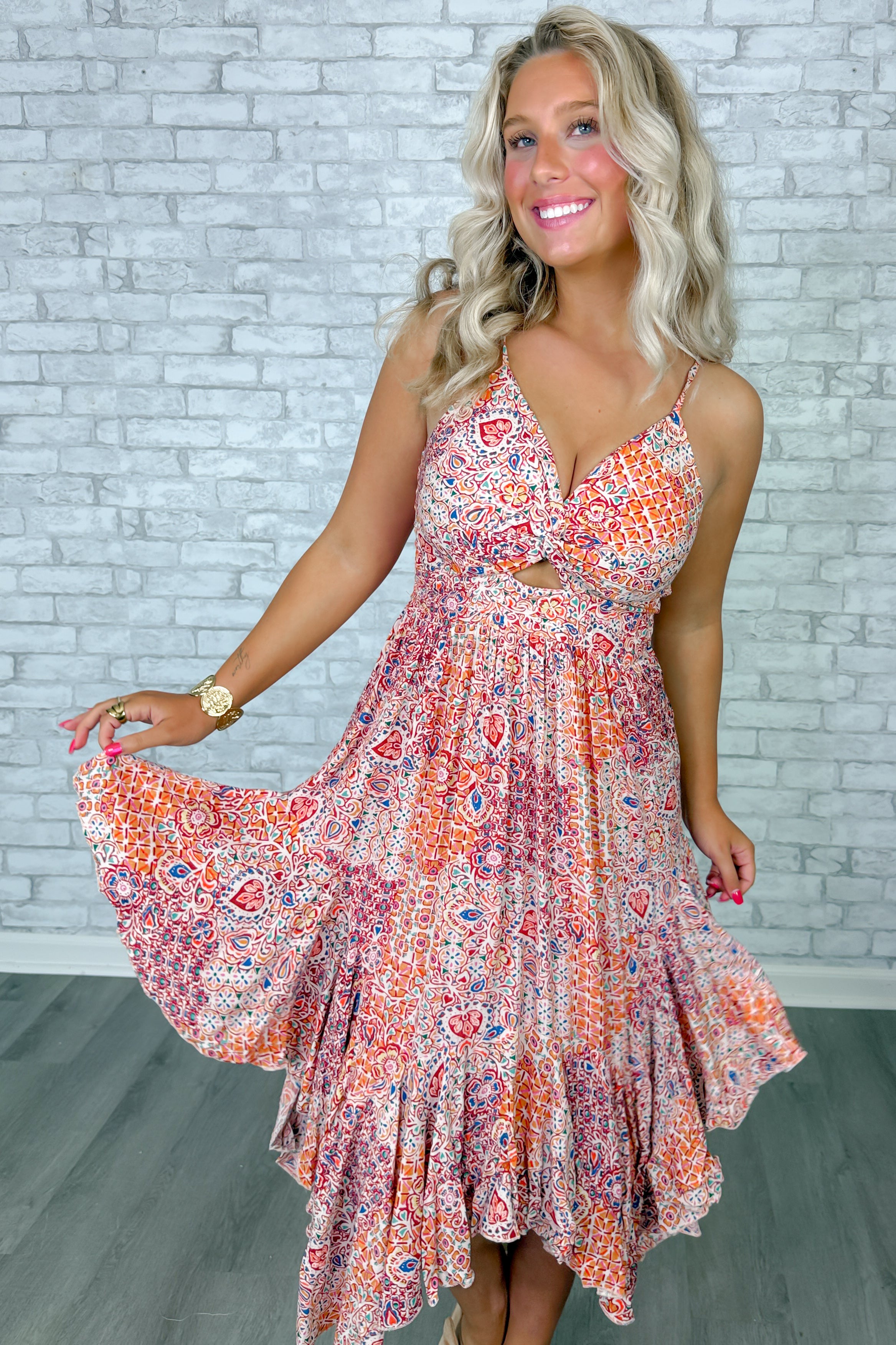 - A statement boho midi dress with warm sunset hues and a flattering twist-front detail.