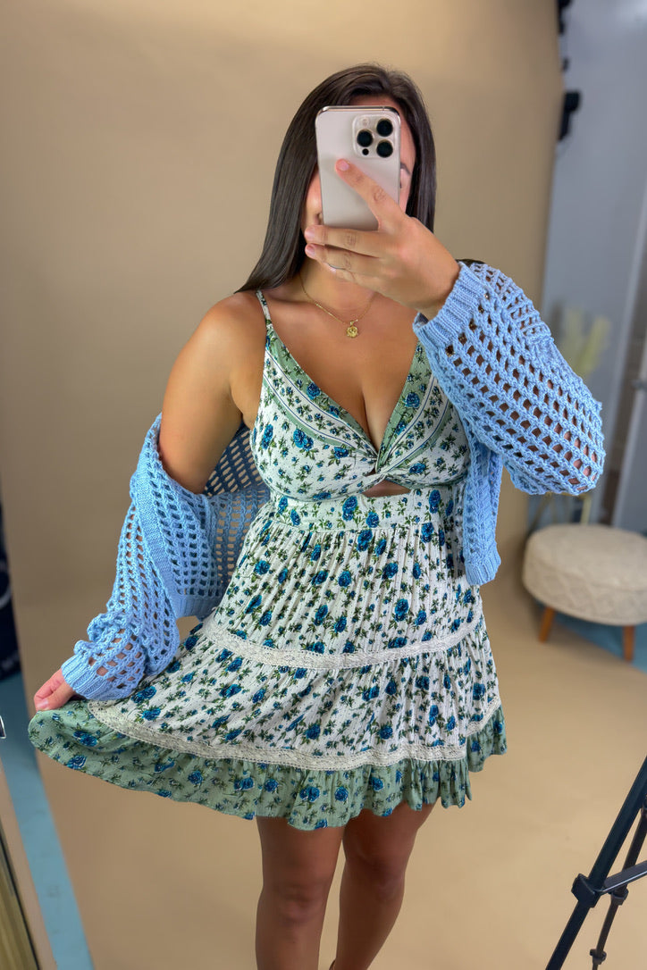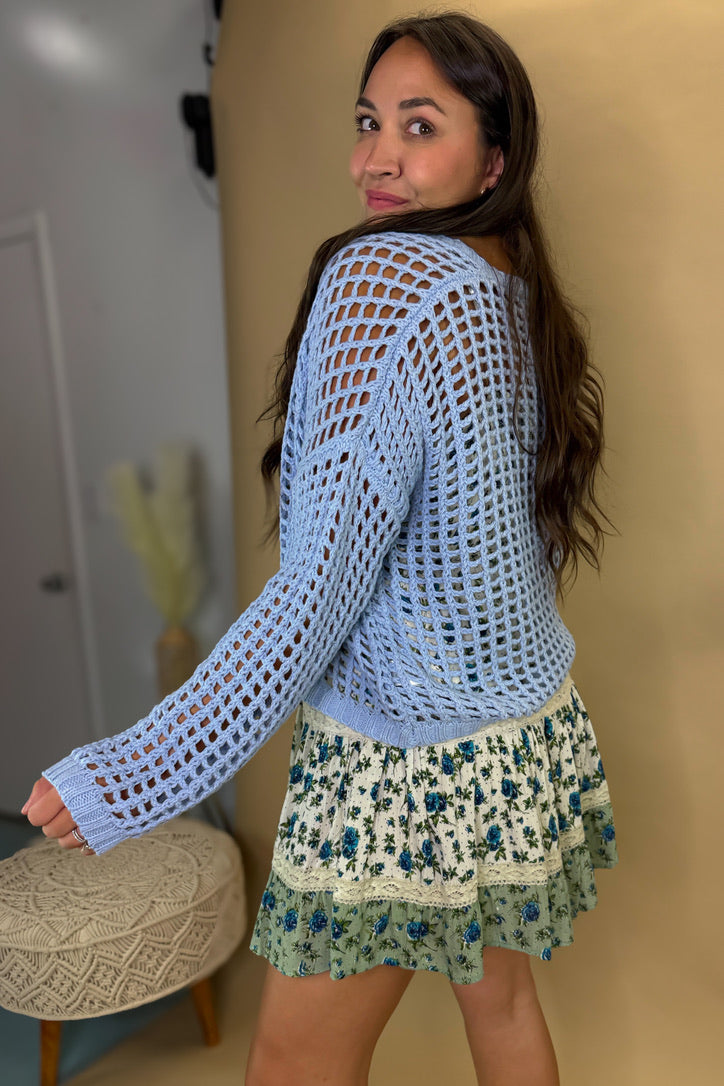 - Meet your new favorite cozy layer: The Willow Open Knit Cardigan in Sky Blue. This dreamy hue paired with the airy crochet knit makes it perfect for those in-between weather days. Toss it over a tank and denim for brunch with the girls or drape it over your shoulders for beach nights — this one will be on heavy rotation all season long!