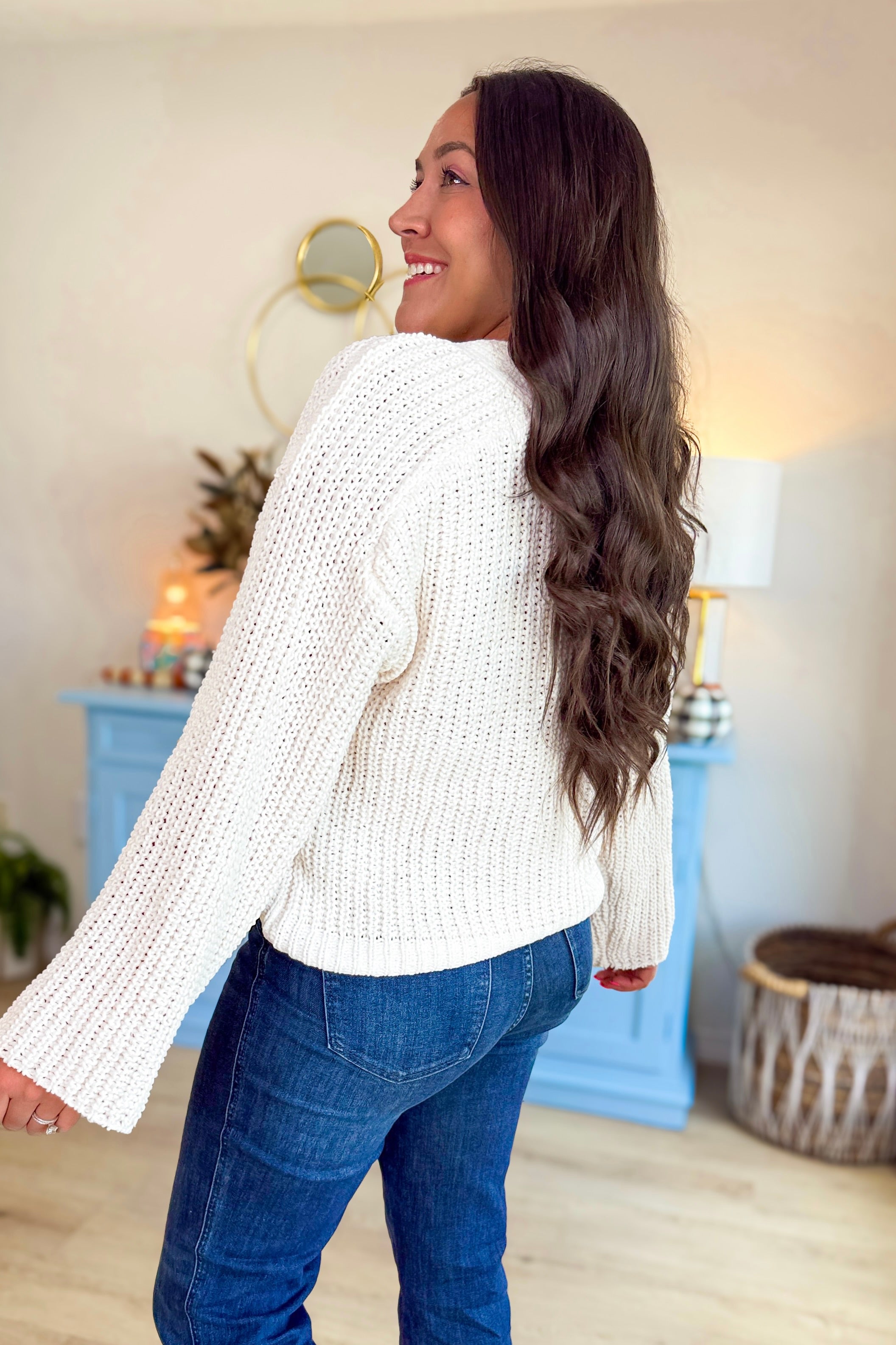 • The soft, textured knit and feminine detailing make it an easy layering piece for both casual days and dressed-up evenings.