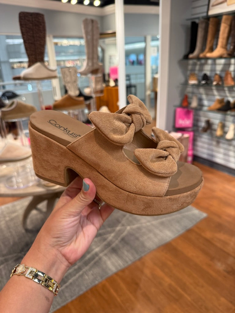 - Step into playful sophistication with these Corky’s sandals featuring chic faux suede bows and a chunky platform heel. Designed for comfort without sacrificing style, they’re the perfect pair to dress up casual outfits or complete a night-out look. Lightweight yet eye-catching, these sandals are made to stand out.