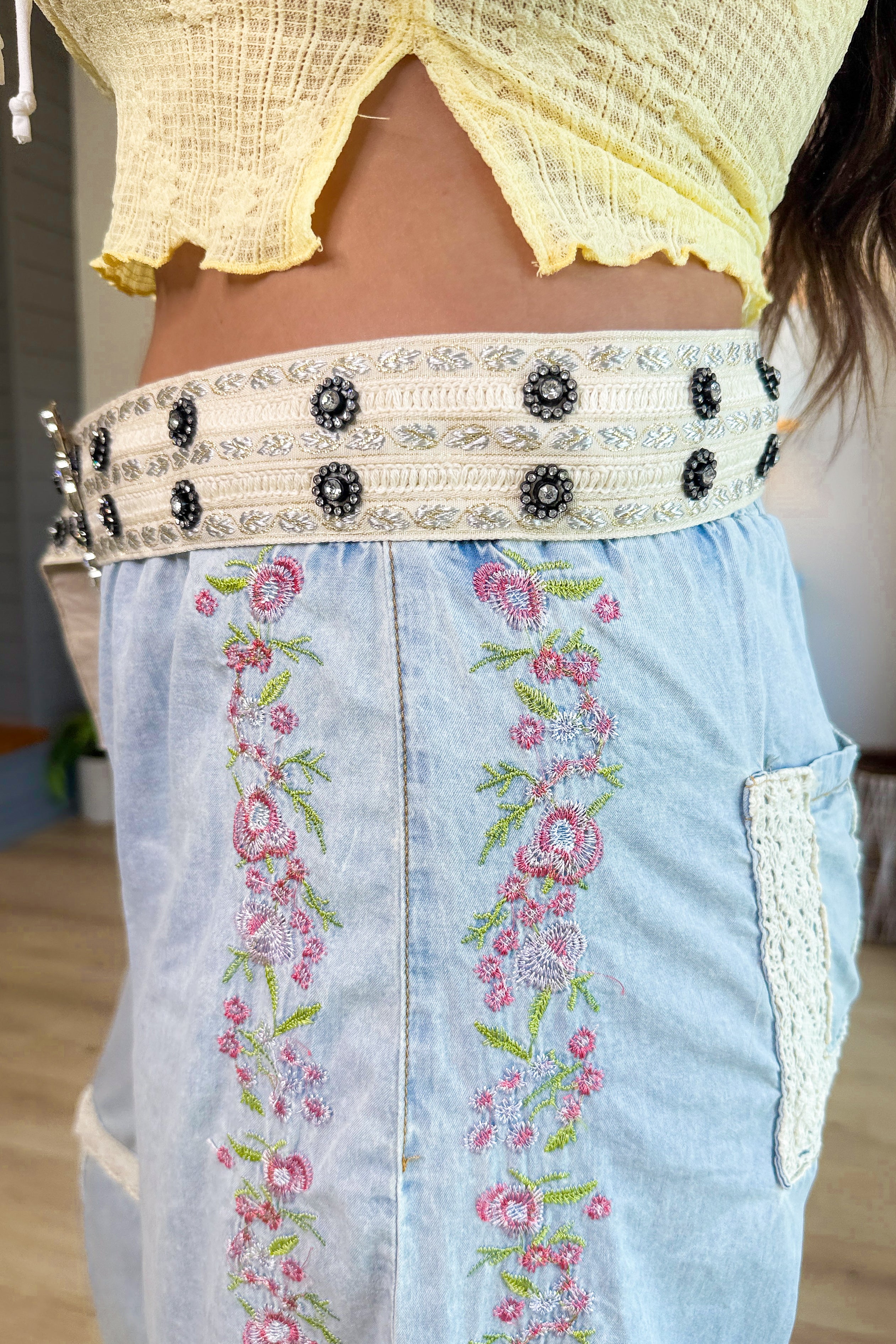 - The Dust & Embers Embellished Belt brings vintage charm with a bold, modern twist. Featuring a cream woven base with intricate embroidery and dark crystal-studded details, this belt is finished with a show-stopping silver buckle wrapped in gemstone accents.