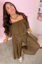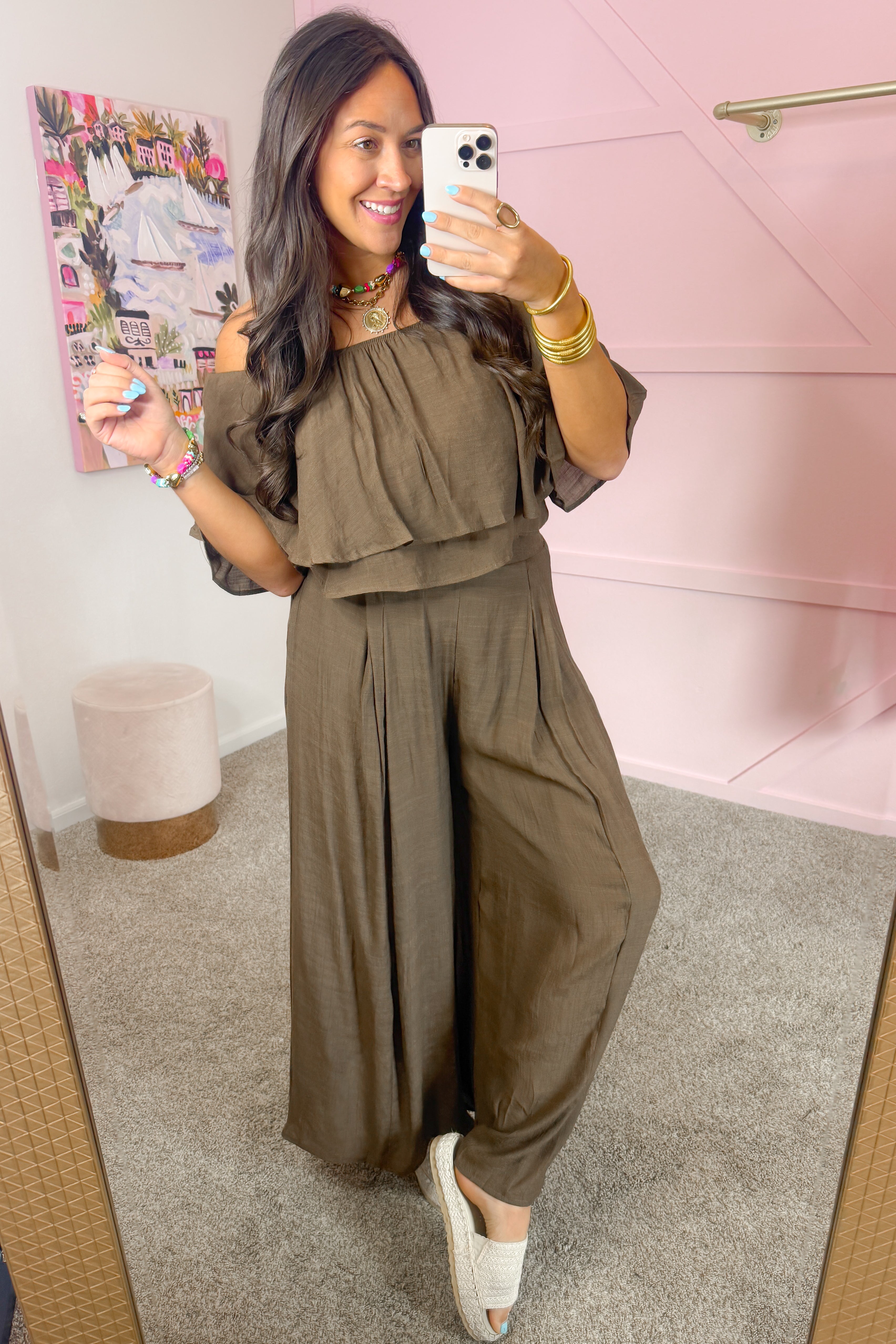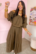 - The off-shoulder ruffle top pairs beautifully with wide-leg pants for an effortlessly elevated look.