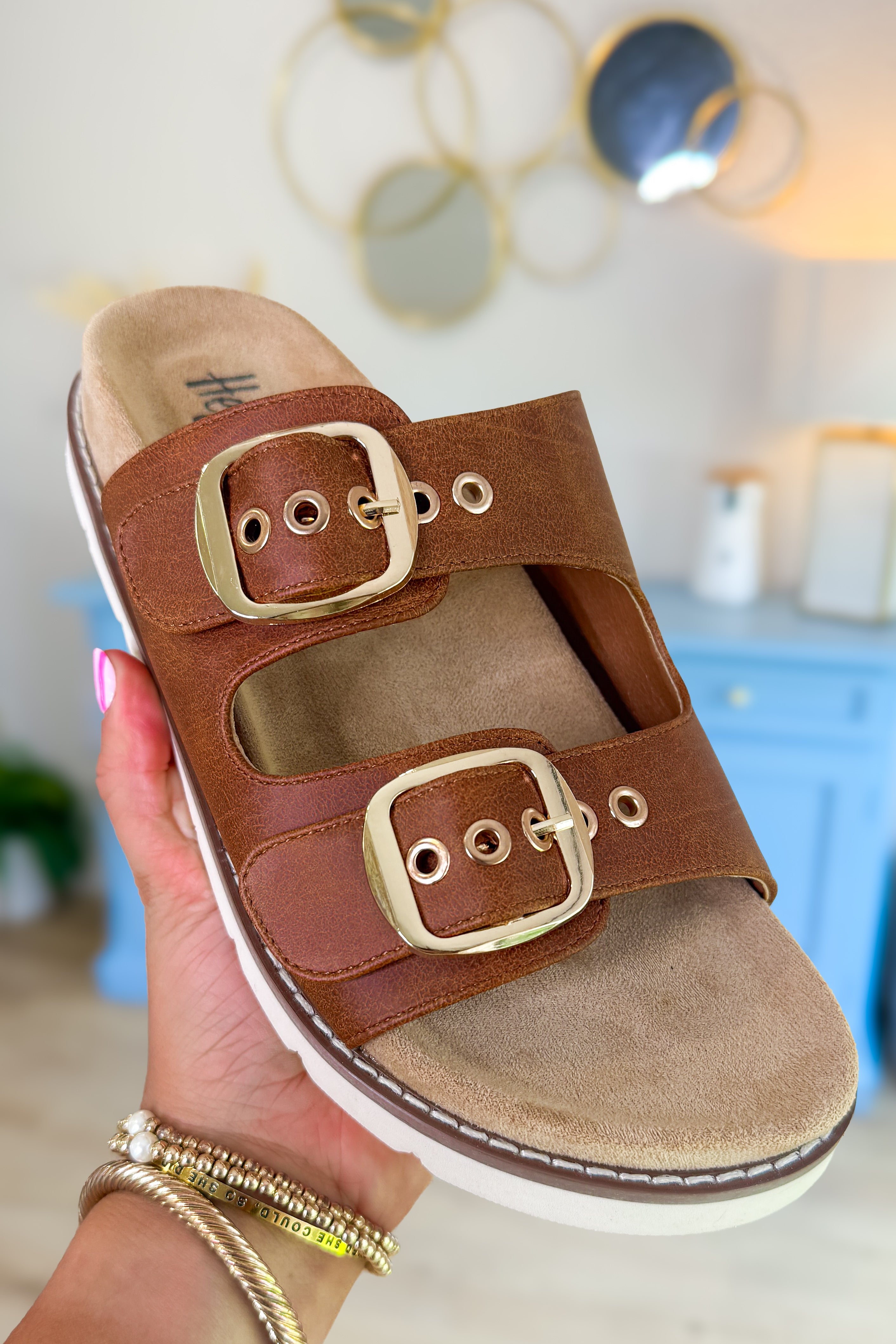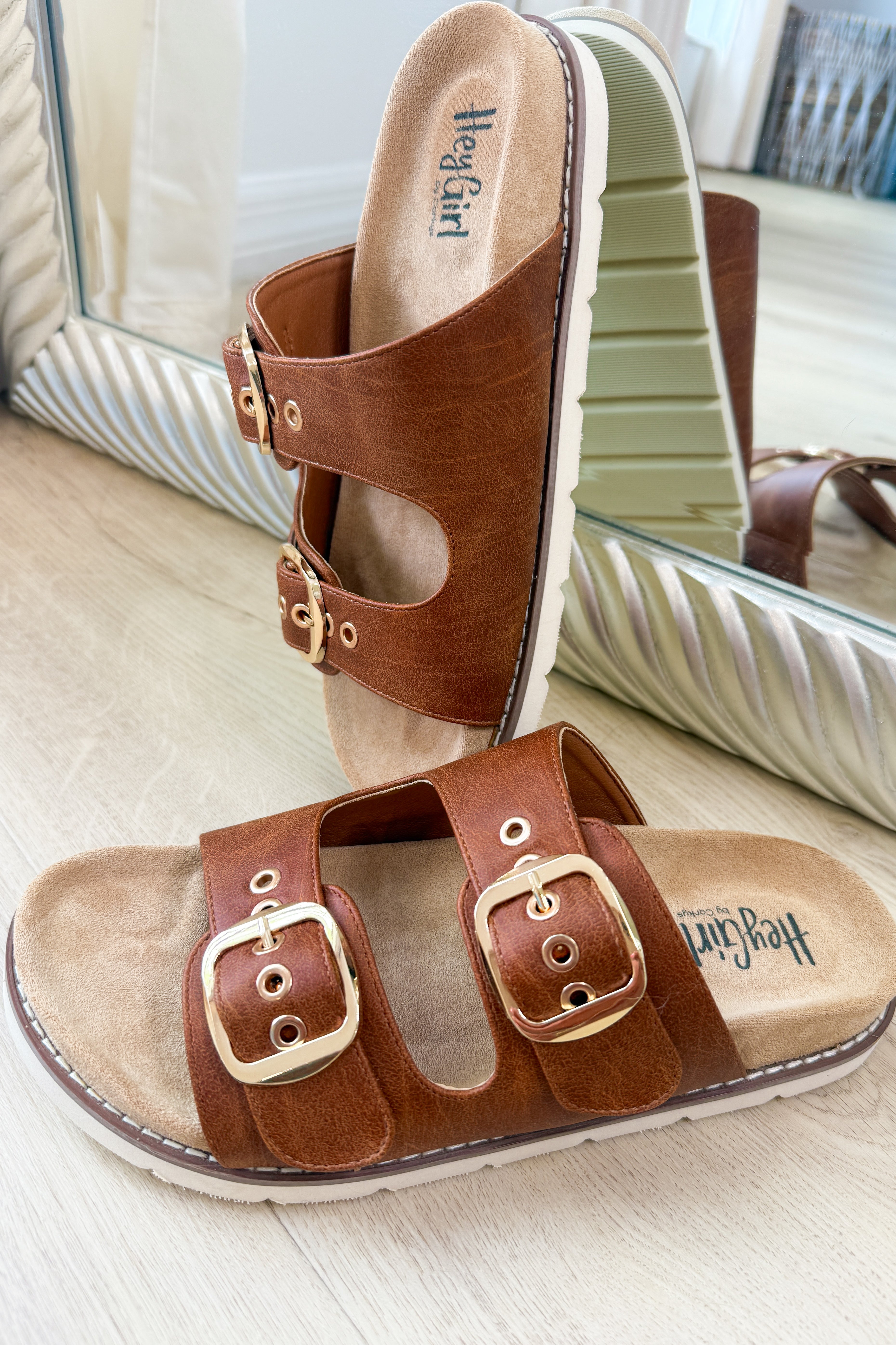 Turn heads with every step in the Feelin' Saucy Slip On Sandal. Designed for everyday comfort and effortless style, this double-buckle sandal features a rich cognac suede upper with bold gold hardware and a cushioned sole that molds to your foot. Easy to dress up or down, it's your go-to shoe for laid-back weekends, beach days, or casual fall strolls.