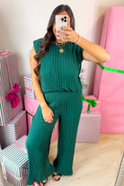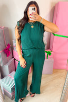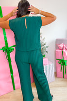 - This two-piece ensemble features a sleeveless pleated top and matching wide-leg pants, both crafted from silky-soft fabric that drapes beautifully for a polished yet comfortable fit.