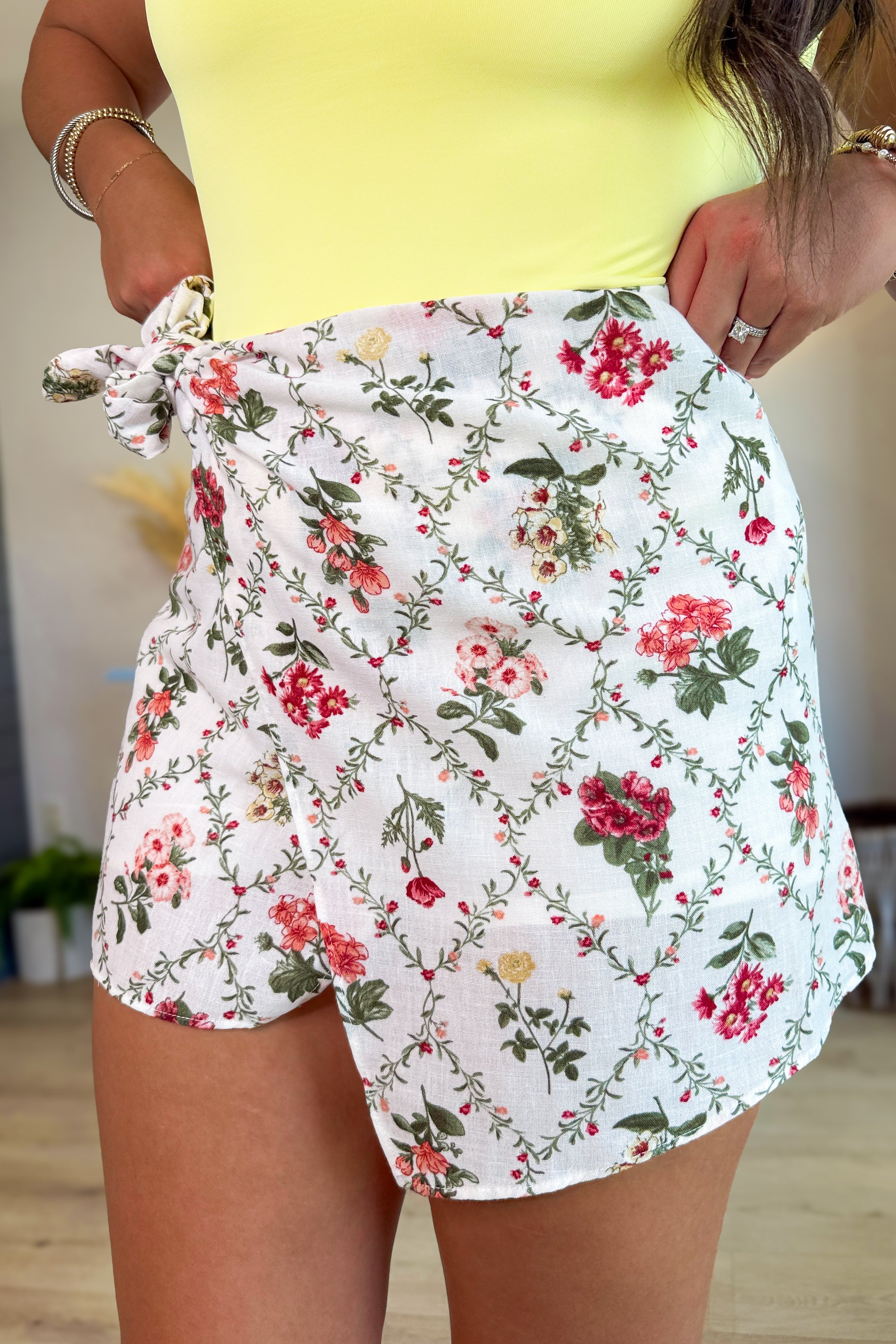 - Soft, sweet, and full of vintage charm—the Garden Bloom Wrap Skort is the perfect piece for sunny strolls, weekend farmers’ markets, and iced lattes with your besties. This floral-print beauty features a feminine faux-wrap front with a bow tie at the waist, and built-in shorts underneath for maximum comfort and confidence. The romantic rose trellis pattern adds that timeless touch while the lightweight linen-blend fabric keeps things cool and breezy all day long.