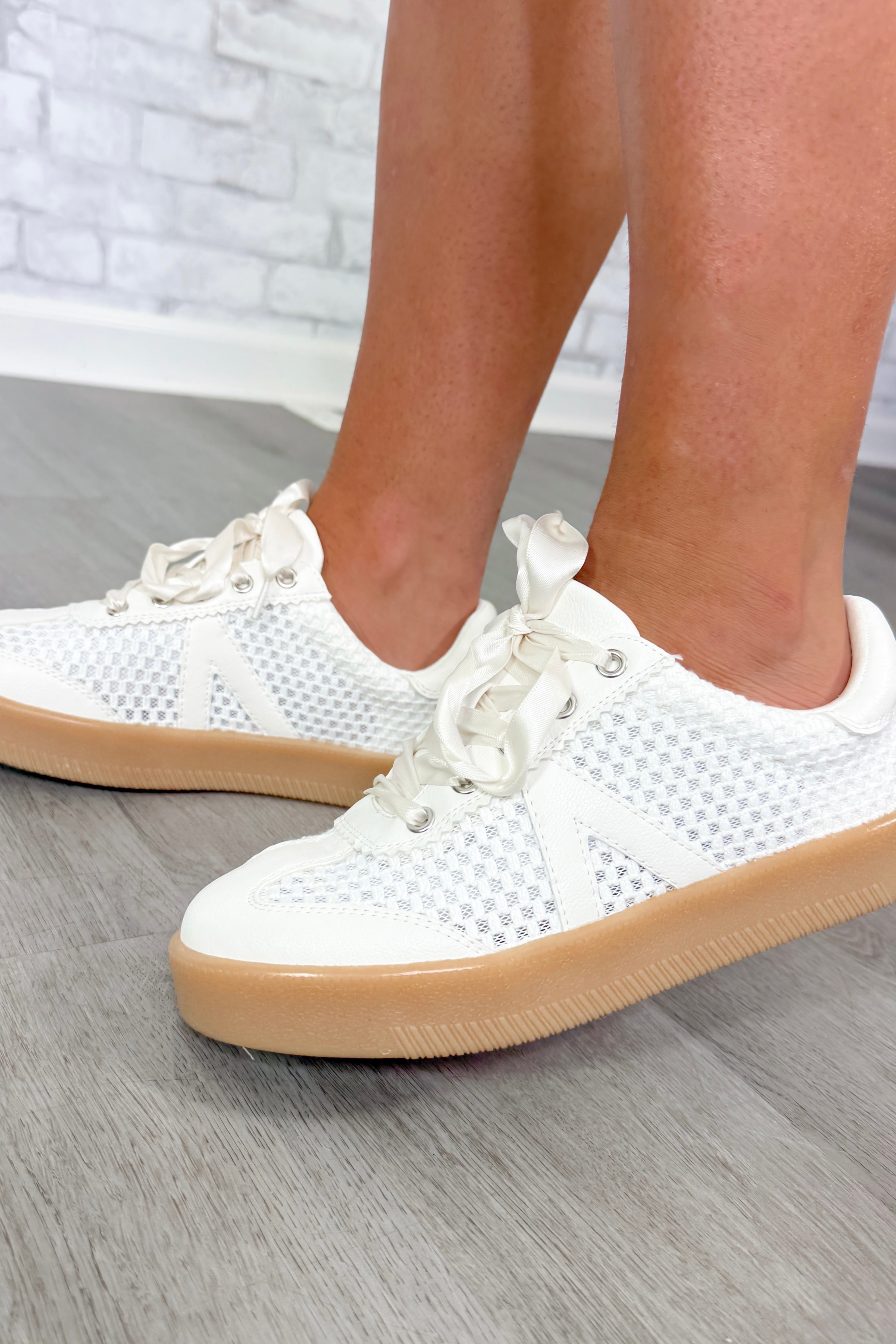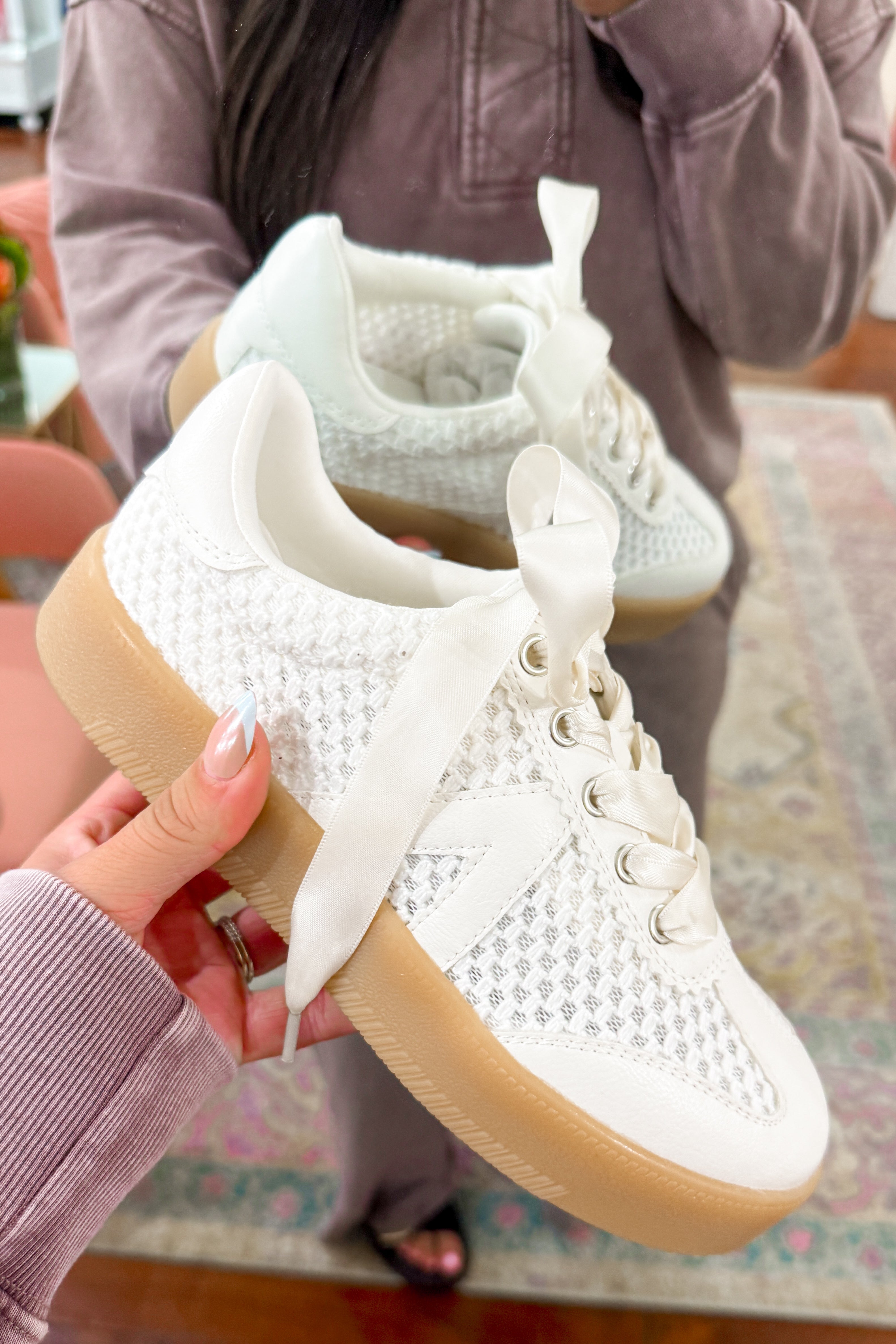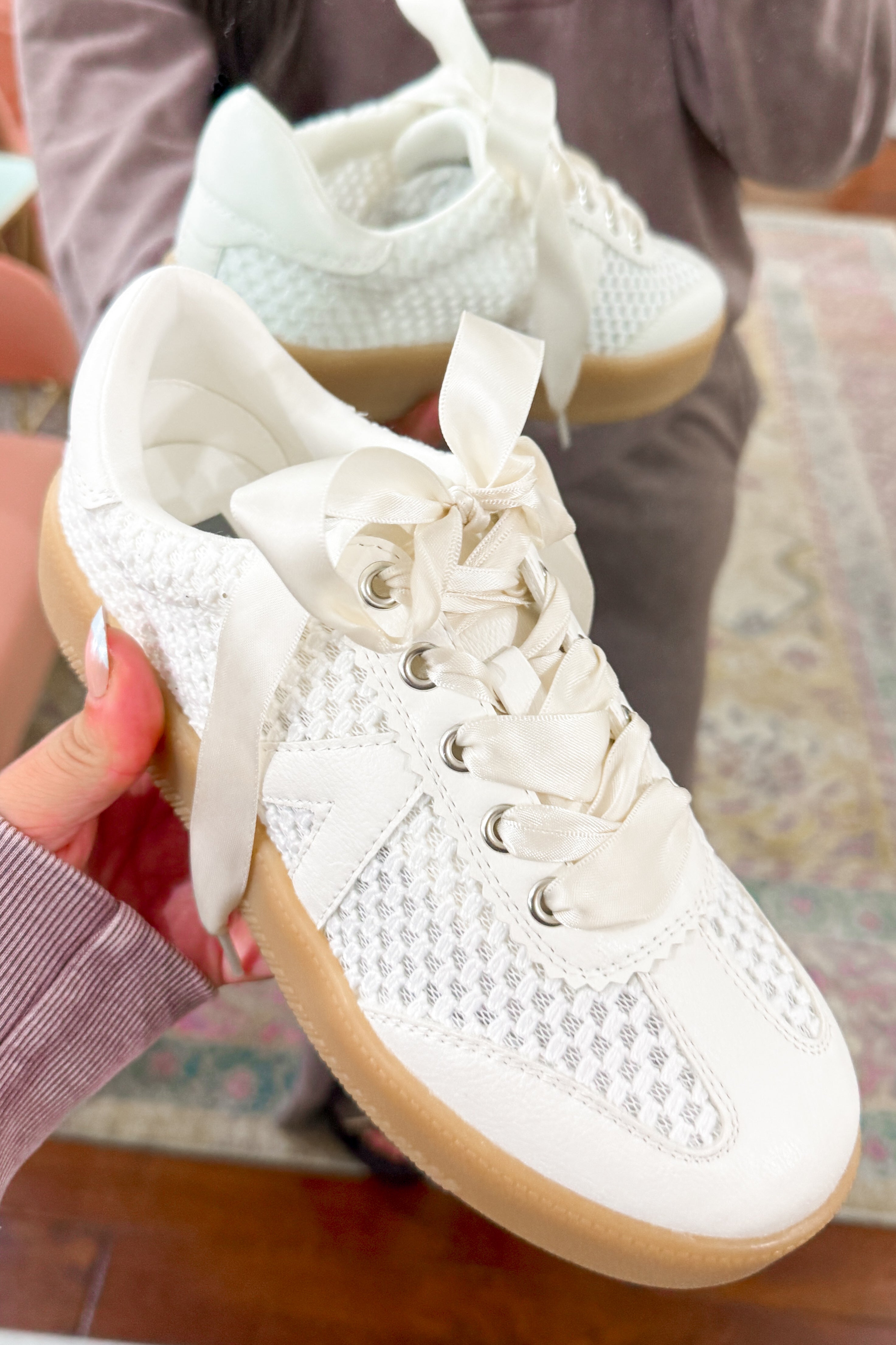 - White sneakers with a woven texture and a standout ribbon lace that adds the perfect girly touch.