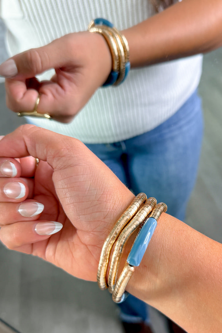 - A modern twist on timeless elegance. These bold bangles features radiant gold plated discs paired with rich blue resin accents.