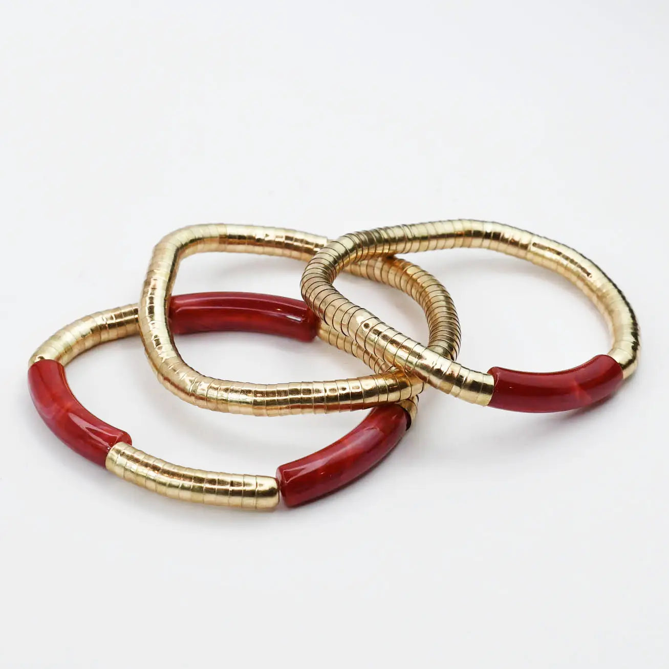 - A modern twist on timeless elegance. These bold bangles features radiant gold plated discs paired with rich maroon resin accents.