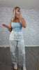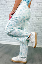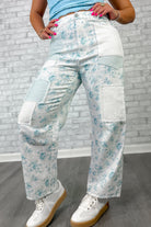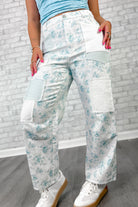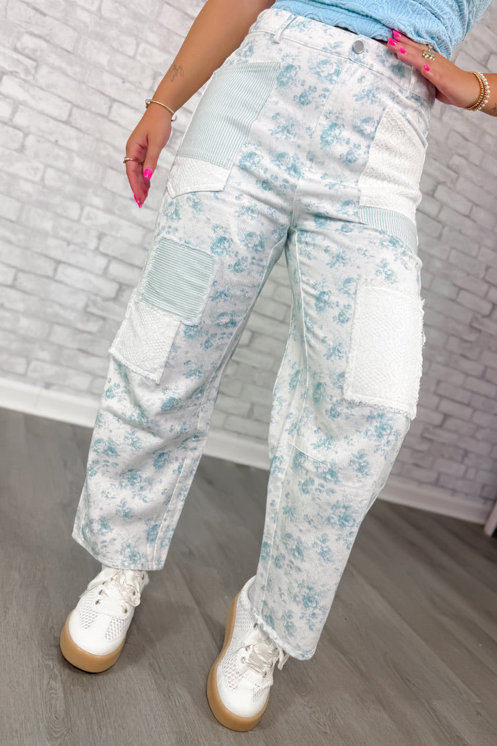 A statement pair of patchwork pants with soft blue florals and textured mixed panels.