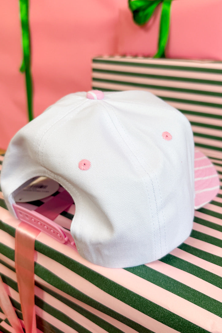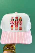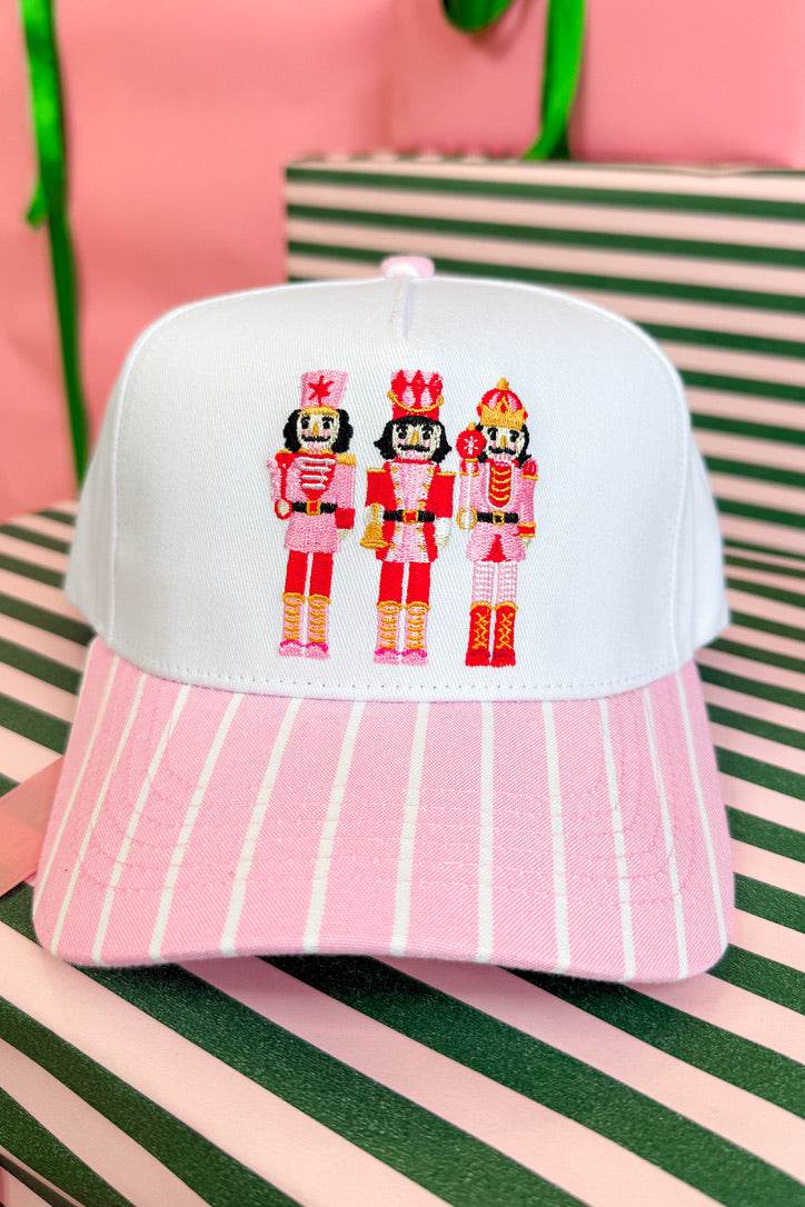 - This hat is adorbs! Featuring three embroidered pink nutcrackers on a crisp white base with a candy-striped pink brim, this festive cap is the perfect mix of girly and merry. Add a playful touch to any outfit — from cozy sweaters to holiday errands — and march through the season in style!