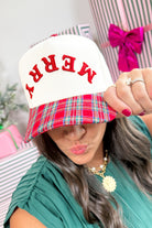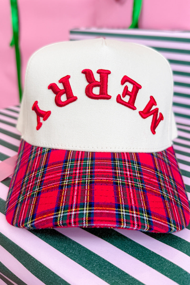 - This festive cap features a cream base, red 3D “MERRY” embroidery, and a classic red plaid brim for that perfect holiday pop. Whether you’re wrapping gifts, running errands, or heading to a holiday party, this hat adds a cheerful touch to any cozy outfit.