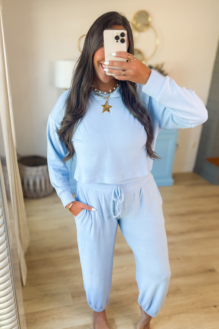 • Slip into all-day comfort with these incredibly soft lounge joggers in a dreamy periwinkle hue. Featuring a relaxed fit, drawstring waist, and cuffed ankles, they’re the perfect blend of cozy and chic.