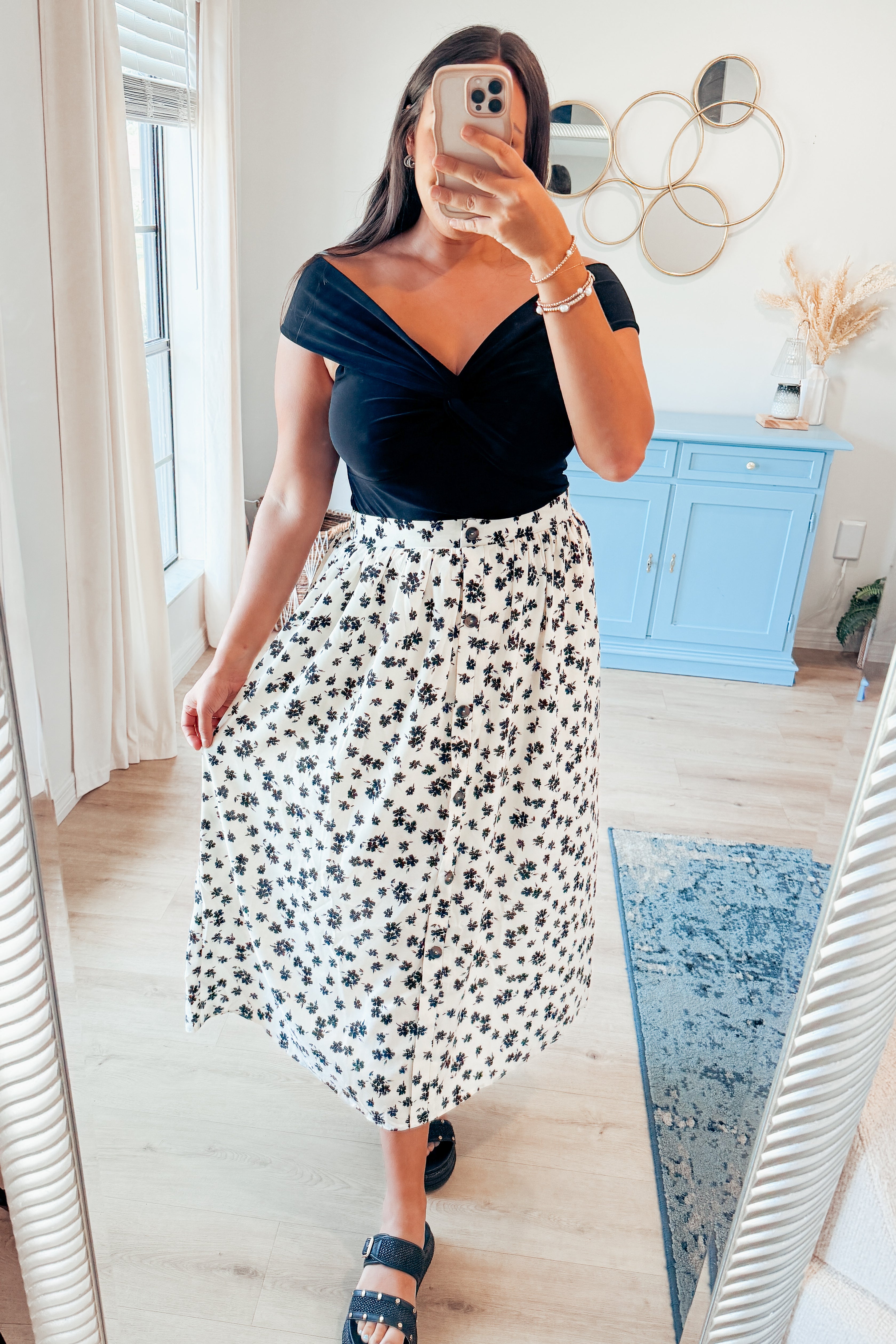 - The Pressed Petals Midi Skirt is classic, feminine, and just the right amount of romantic. Featuring a vintage-inspired black floral print on a soft cream base, this button-front midi has the perfect amount of movement and charm. The lightweight fabric and elastic waistband make it effortless for everyday wear—whether you're heading to the farmers market or dressing it up with heels for dinner.