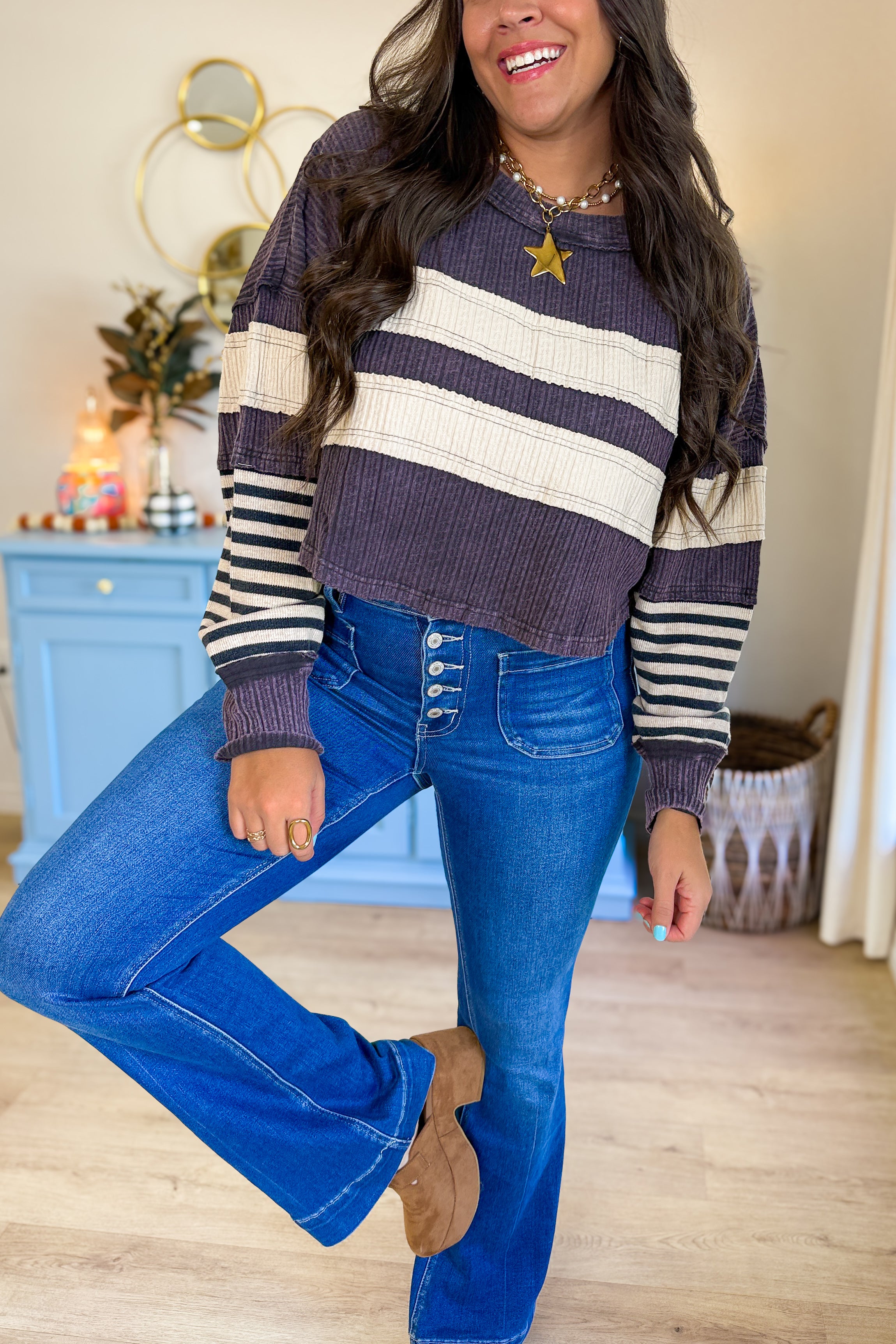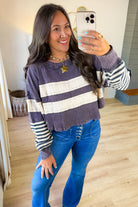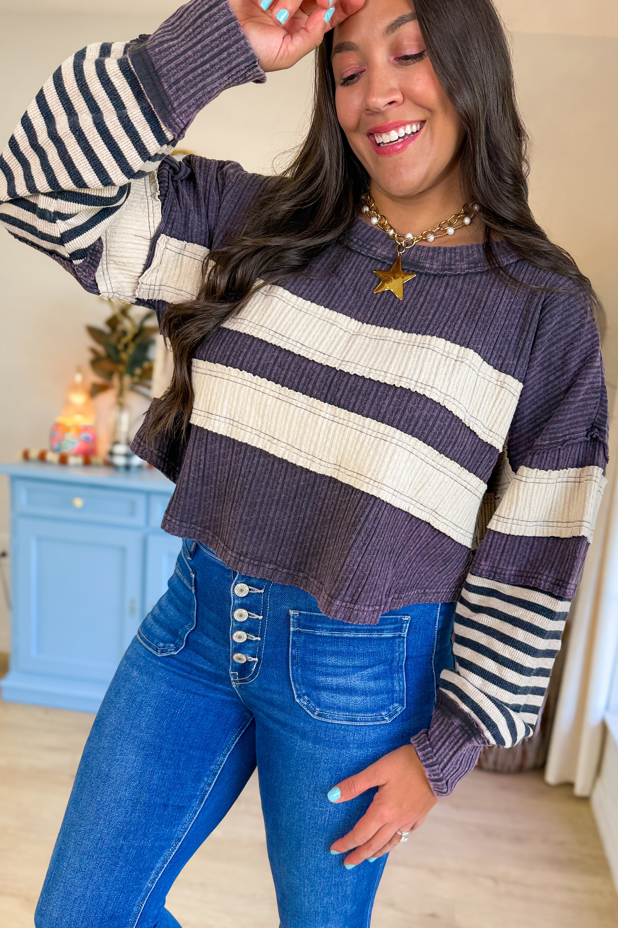 - Infuse your style with a warm bohemian touch in this striped knit top. Its relaxed silhouette and ribbed textures give it an easygoing, lived-in feel while the earthy tones add vintage-inspired charm.