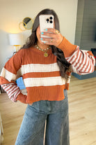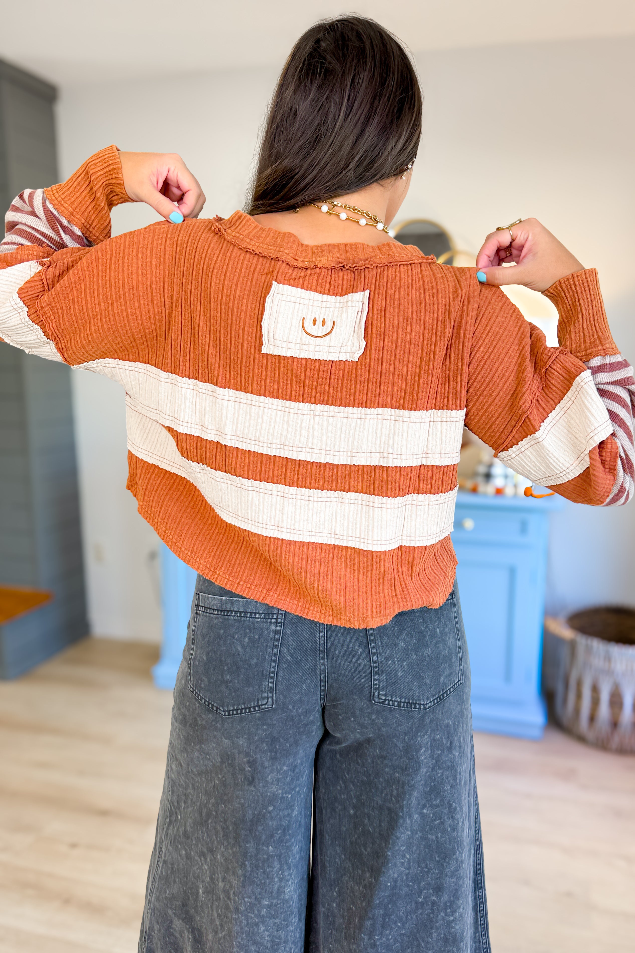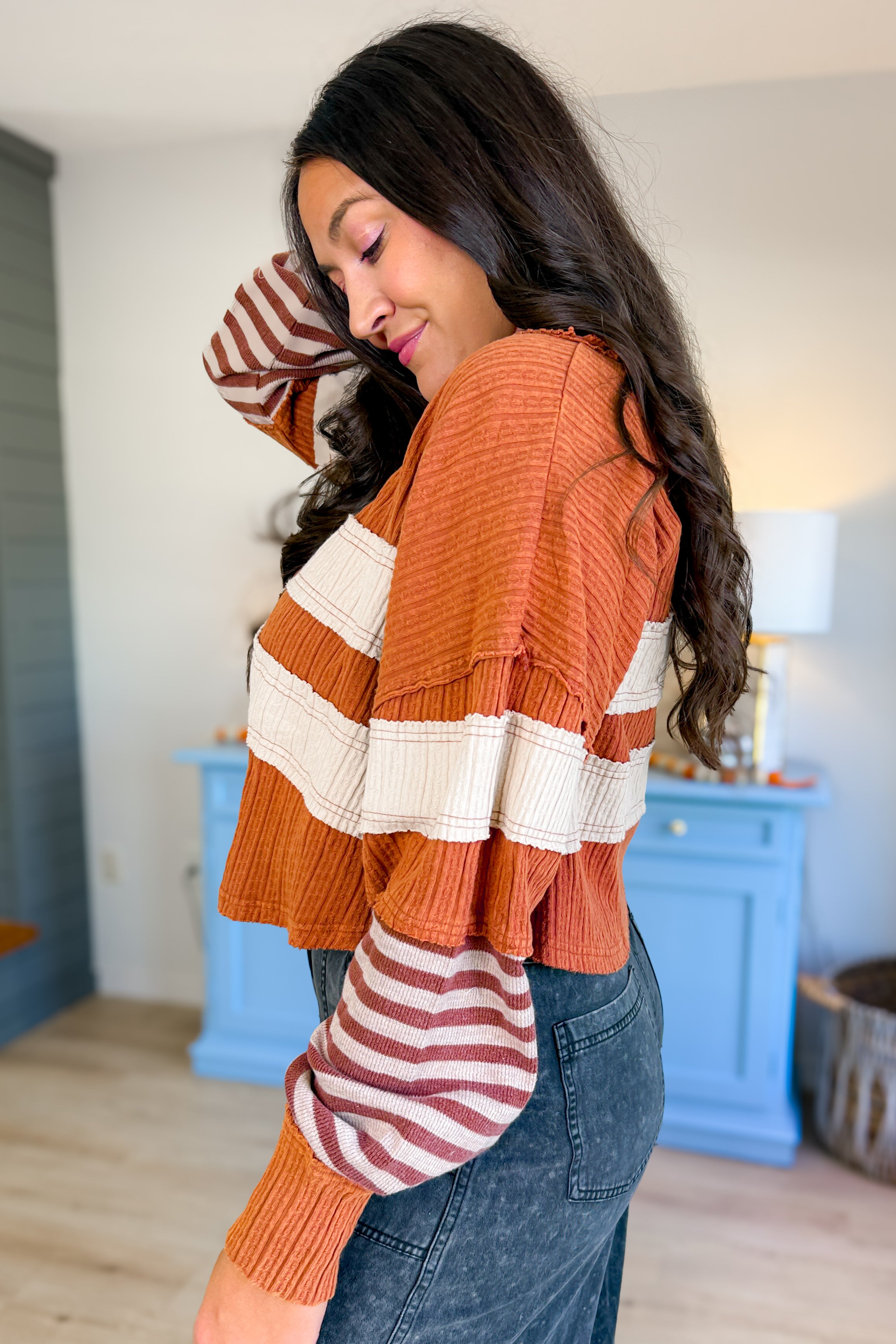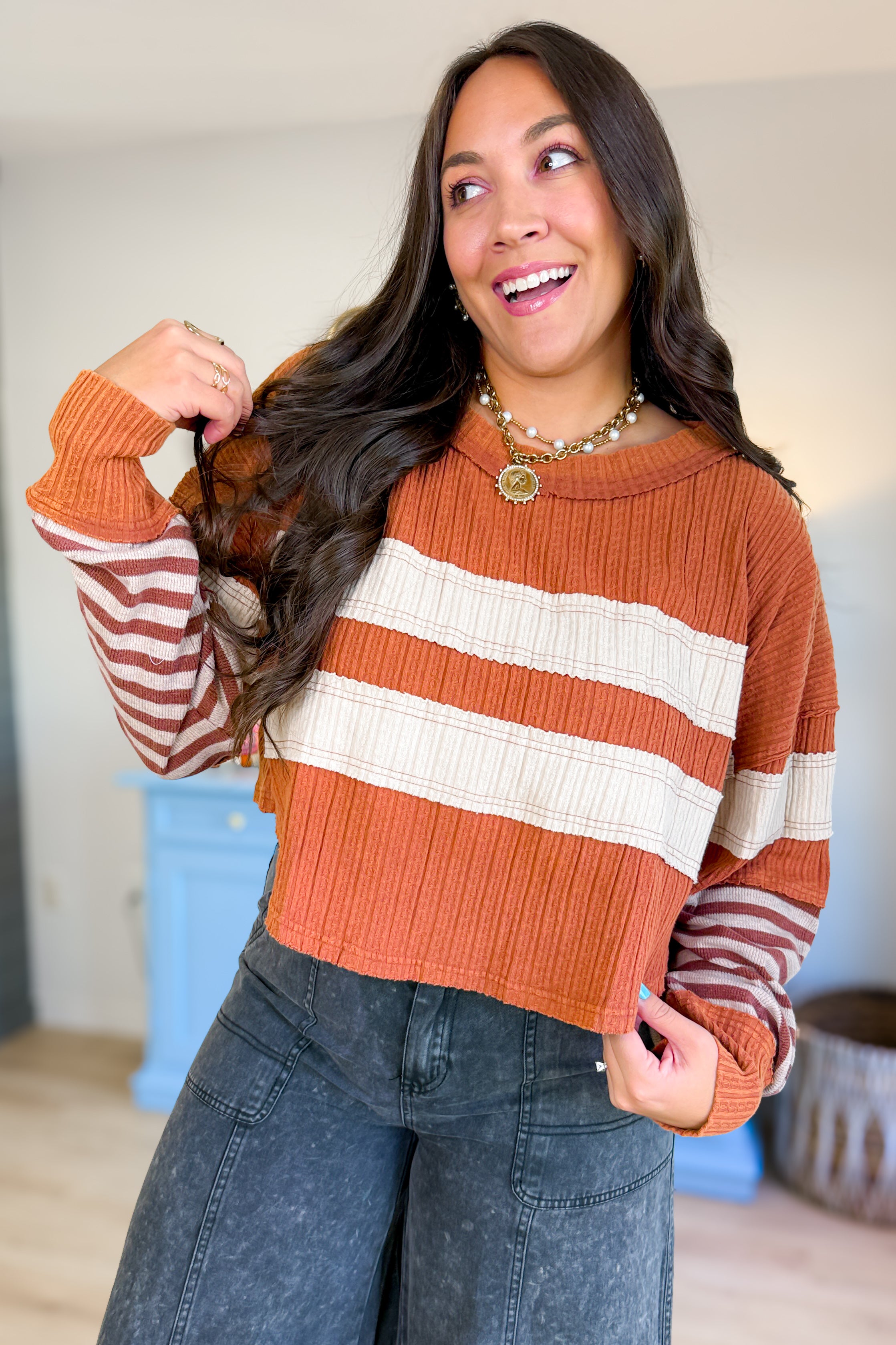 - Infuse your style with a warm bohemian touch in this striped knit top. Its relaxed silhouette and ribbed textures give it an easygoing, lived-in feel while the earthy tones add vintage-inspired charm.