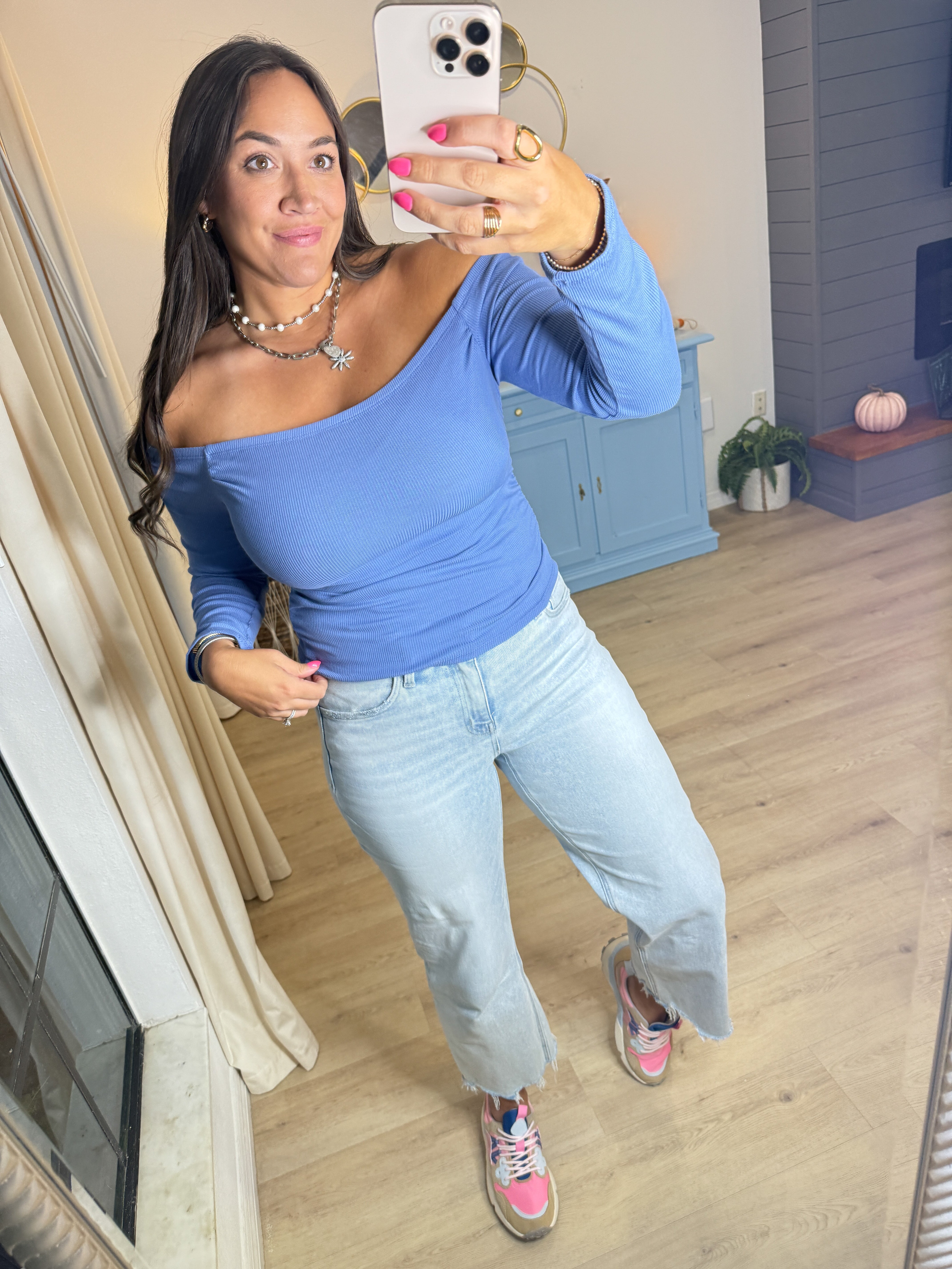 - This off-shoulder top features a sleek, fitted silhouette that’s equal parts chic and versatile. With its flattering neckline and long sleeves, it’s perfect for dressing up with tailored pants or keeping it casual with denim. A timeless piece that adds effortless elegance to any outfit.