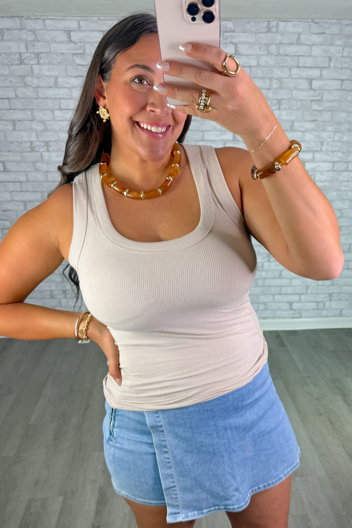 - Scoop neckline and wide straps for a flattering, supportive fit