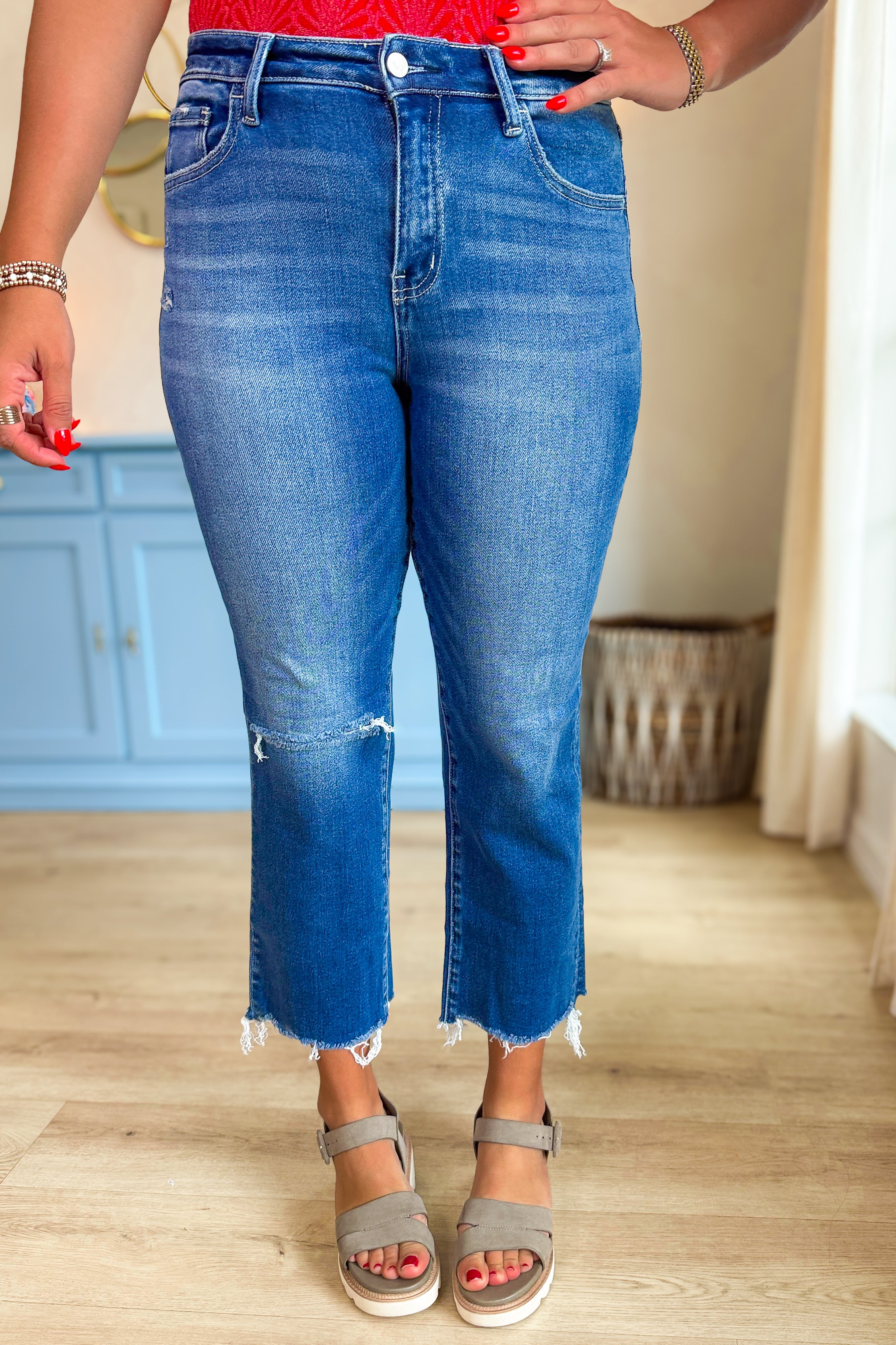 - Say hey to your new go-to jeans: the Frankie Distressed Crop Jeans. These mid-to-dark wash denim pants feature a flattering high rise, edgy knee rip, and a raw, frayed hem that gives off just the right amount of cool-girl energy. The cropped length makes them easy to wear with everything from sneakers to sandals to boots.