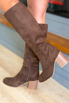 - These sleek knee-high boots feature a rich chocolate hue, a stacked block heel, and a clean, structured silhouette that gives effortless street-chic vibes. Whether you’re styling them with cozy knits, denim, or a mini dress, these boots are the definition of modern sophistication.