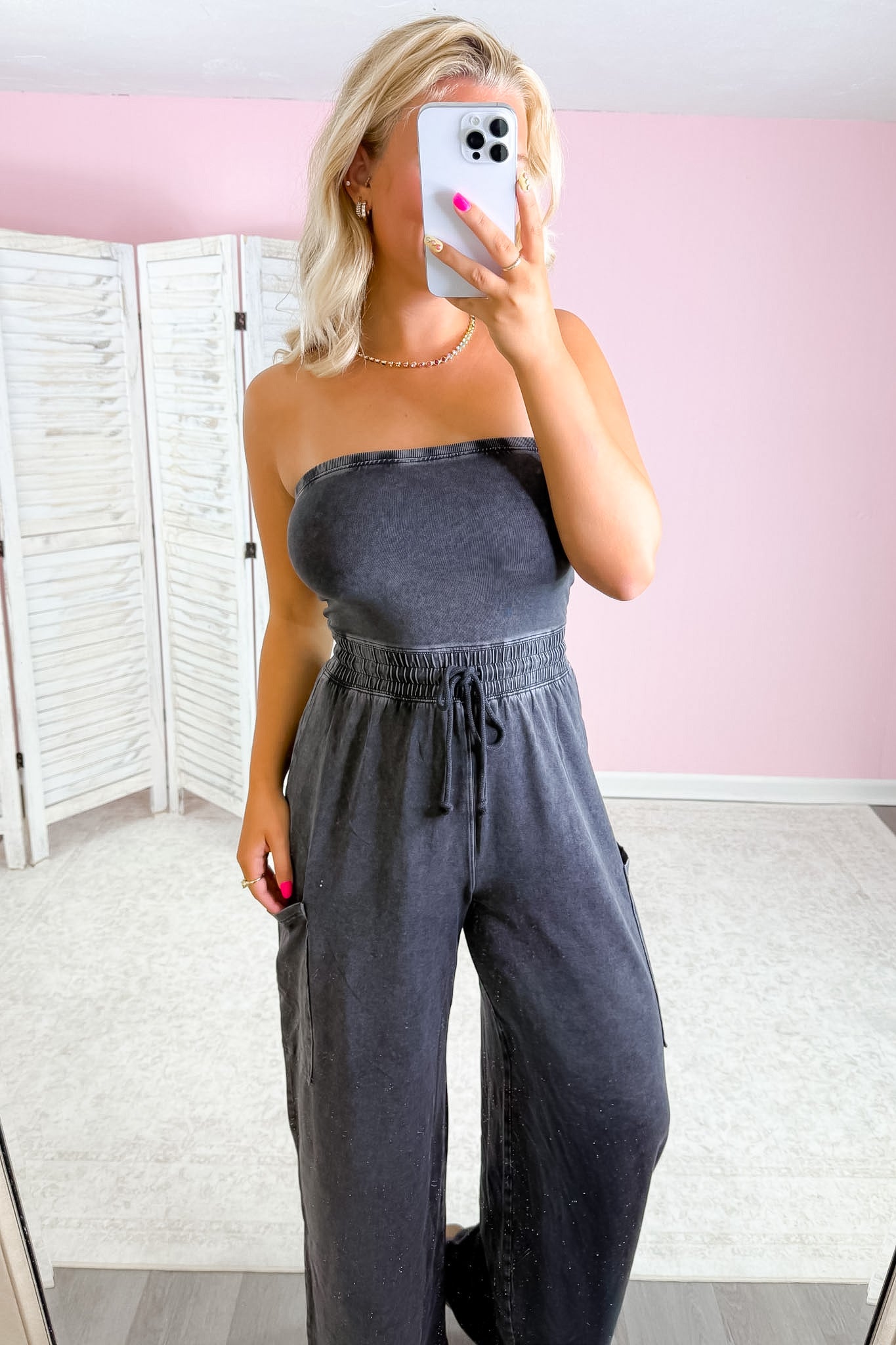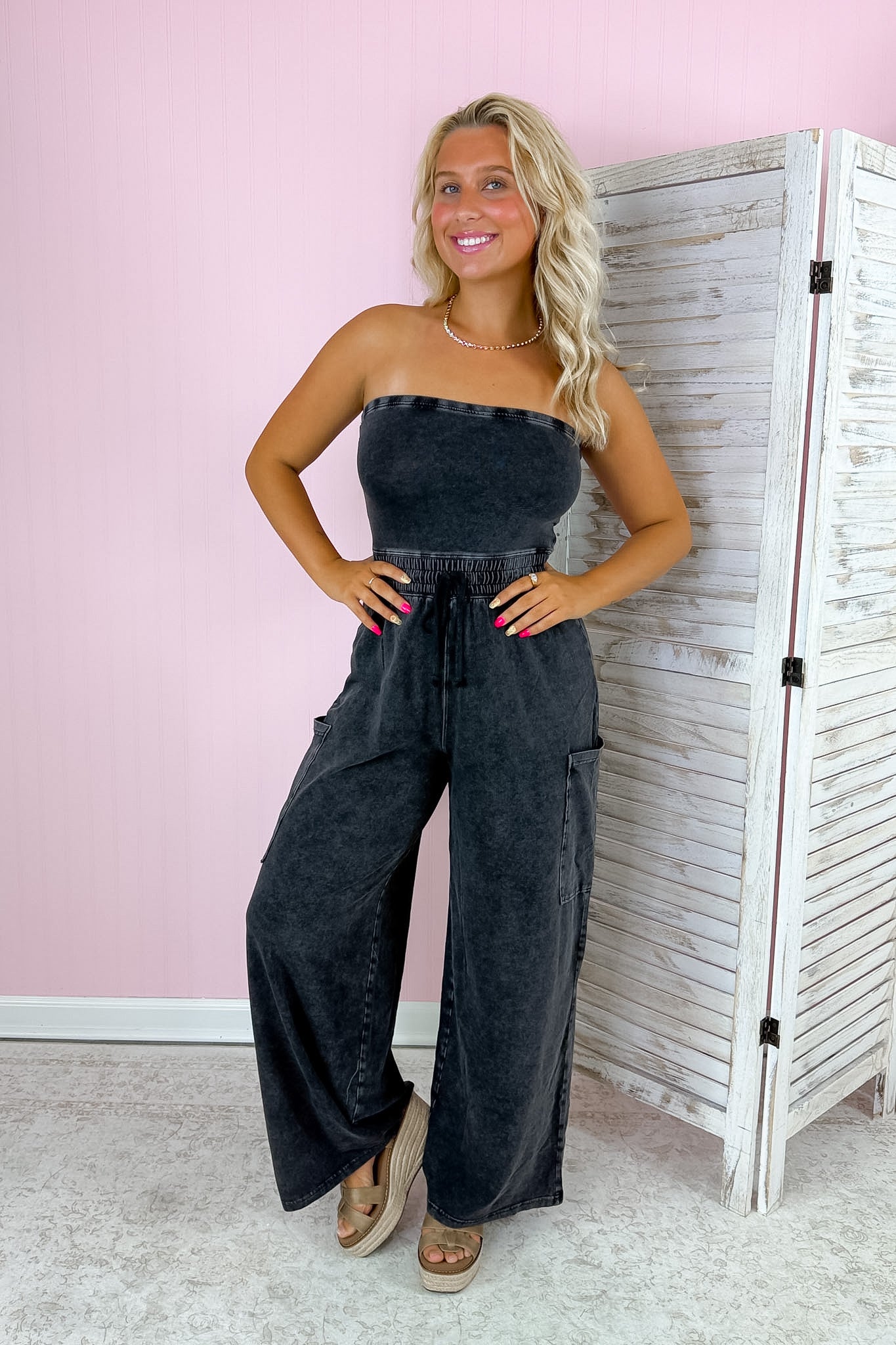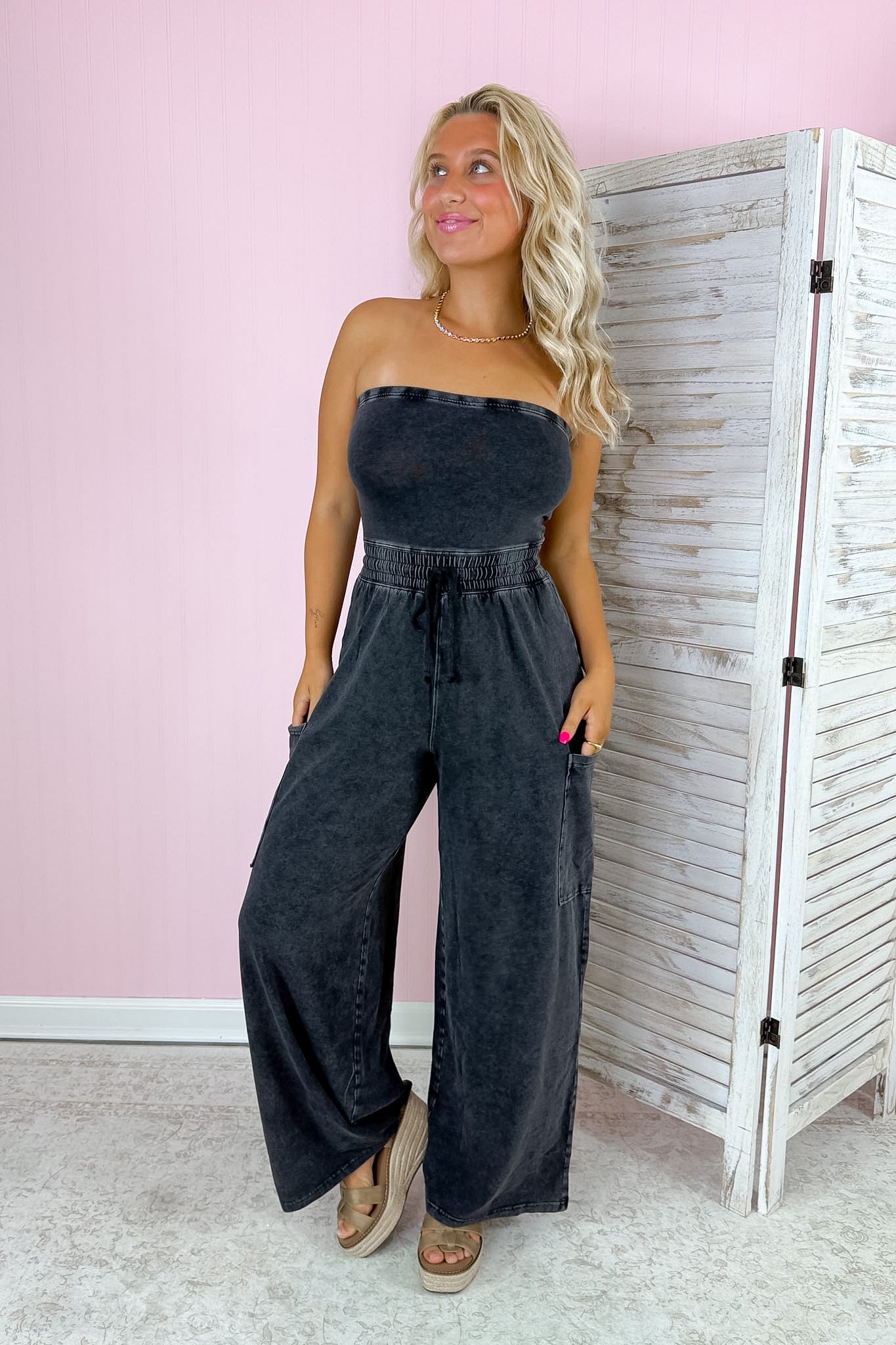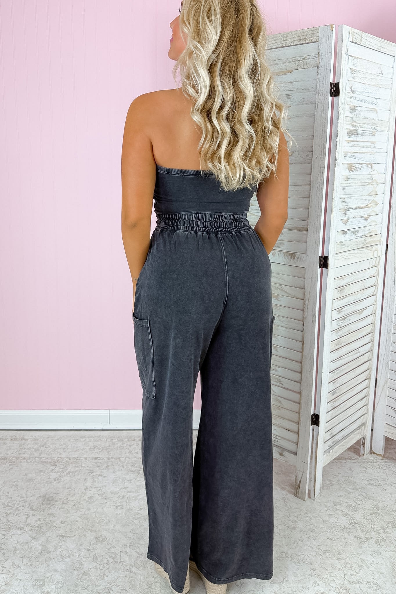 - A bold strapless jumpsuit designed with a relaxed, wide-leg silhouette.