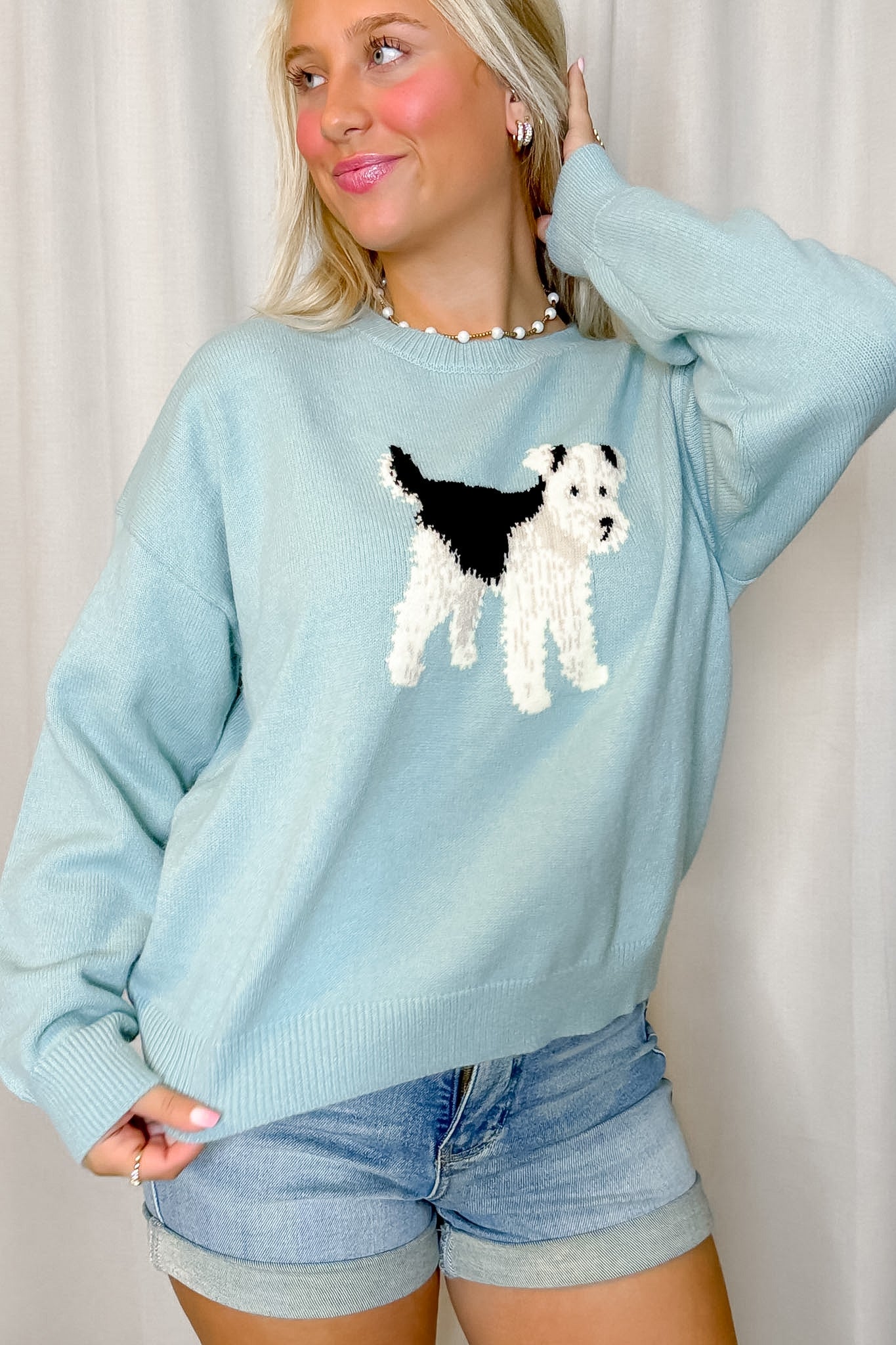 - The coziest sweater for dog lovers, featuring an adorable vintage-style fox terrier graphic on soft, lightweight blue sweater.