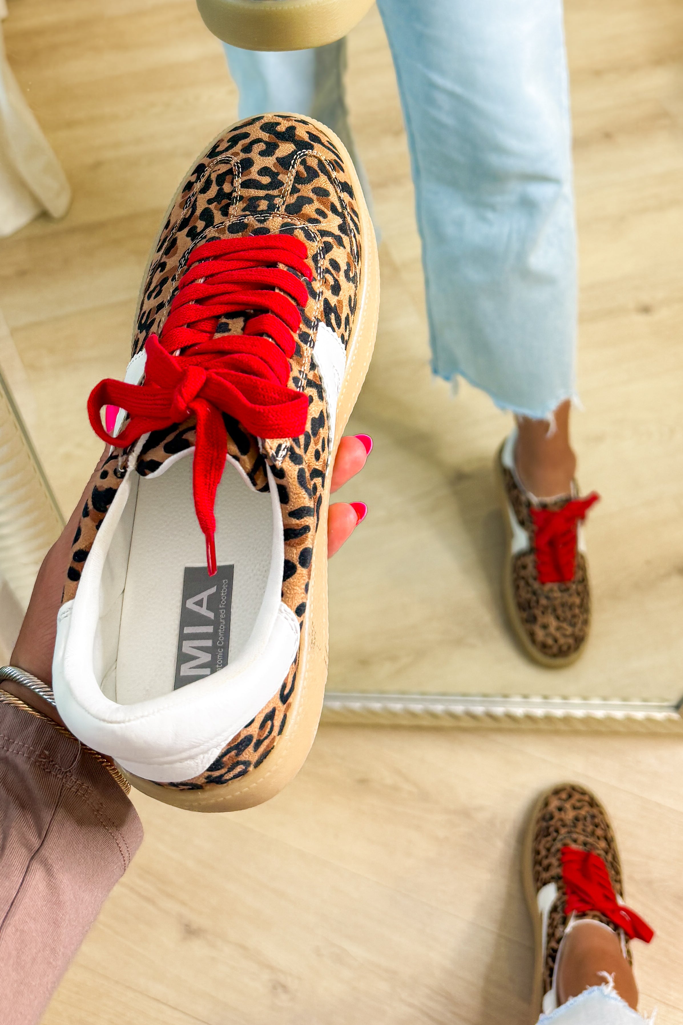- Step out in fearless style with these MIA sneakers featuring a bold leopard print and eye-catching contrast details.