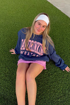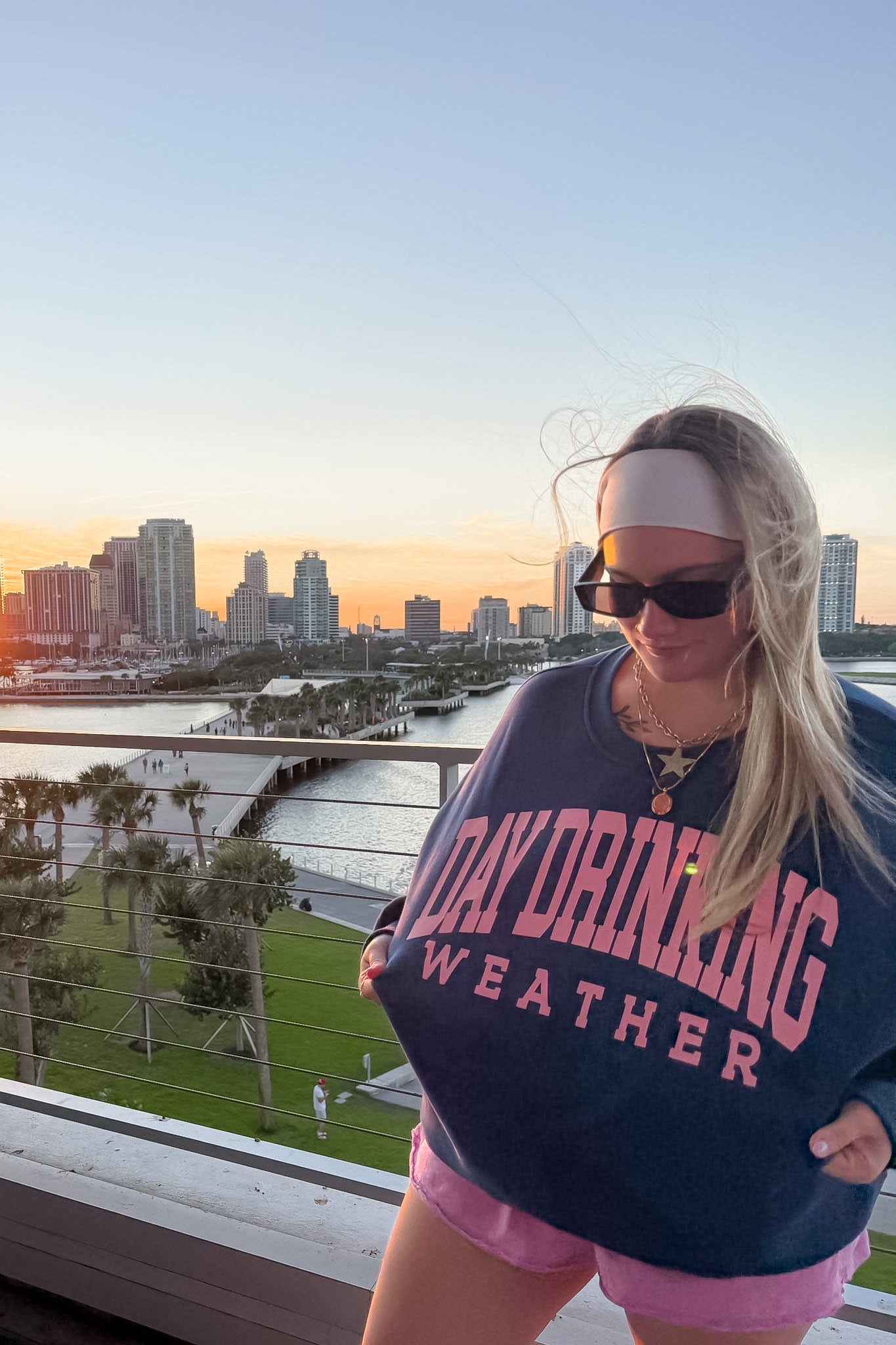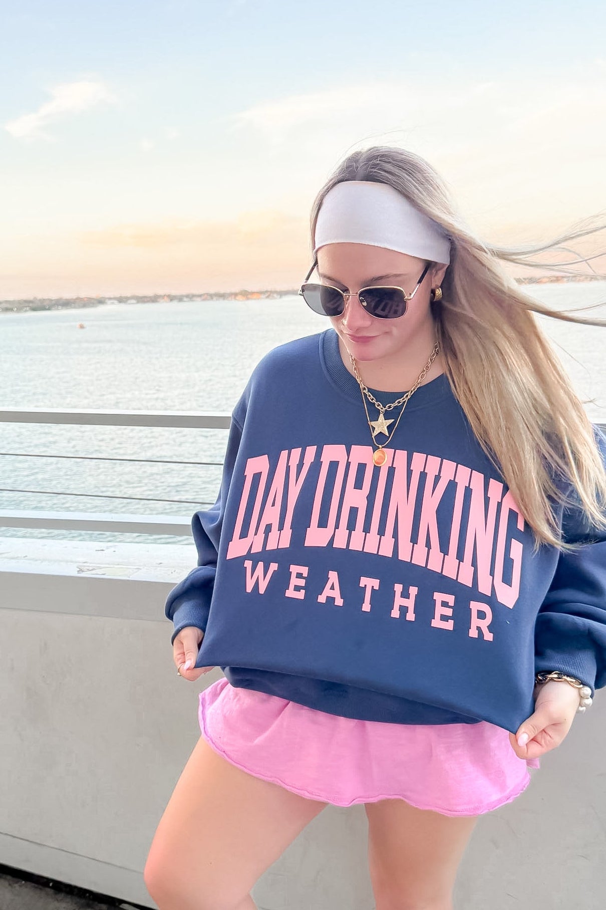 - Oversized navy crewneck with bold pink “Day Drinking Weather” graphic