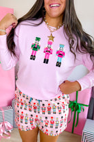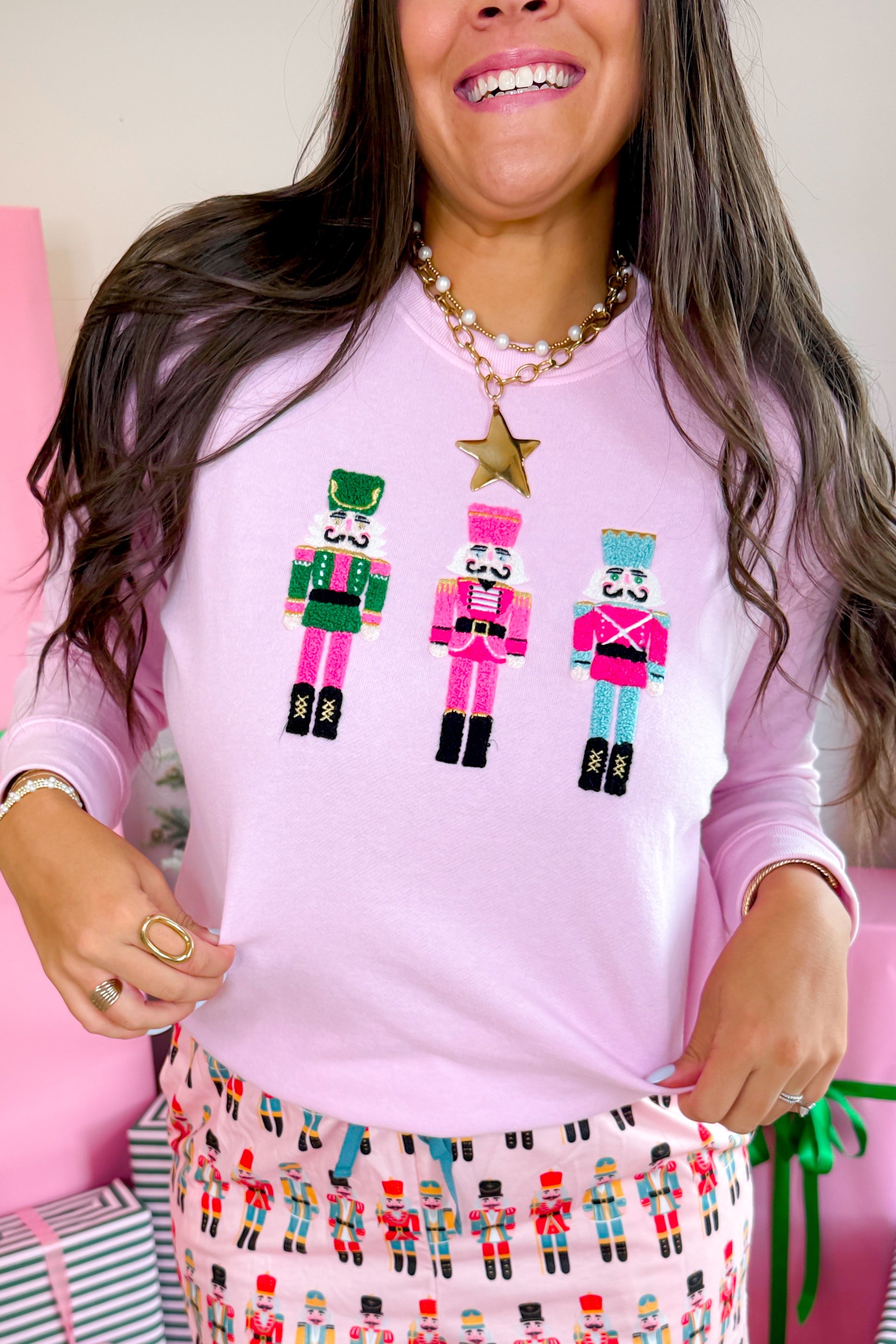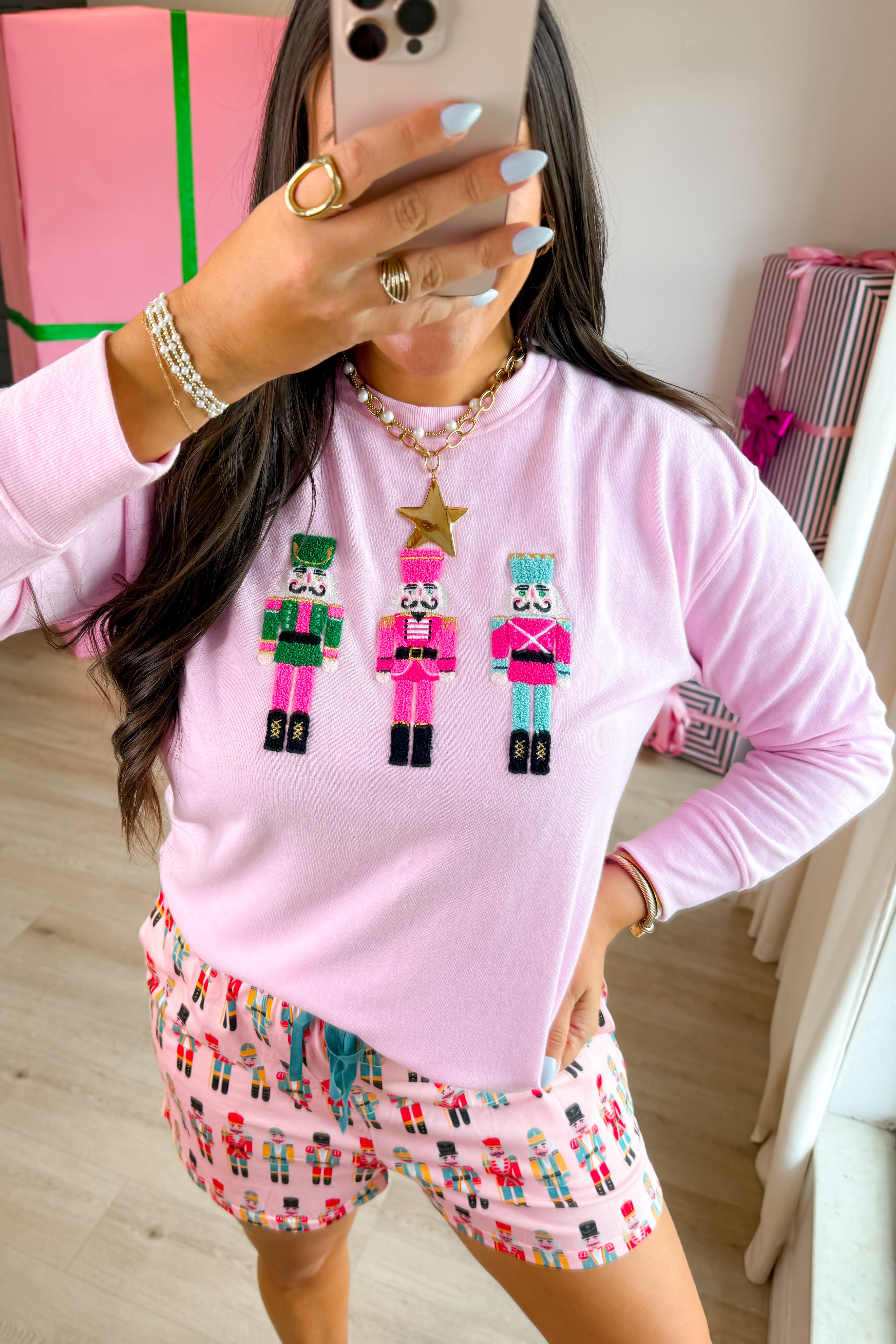 - The adorable Nutcracker Sweatshirt is made from a lightweight cotton blend and features a chic pink background with the three different nutcracker icons embroidered in vibrant, festive colors on the front. Its classic round neck and banded hems make it the perfect casual fit and your ultimate holiday season accessory.