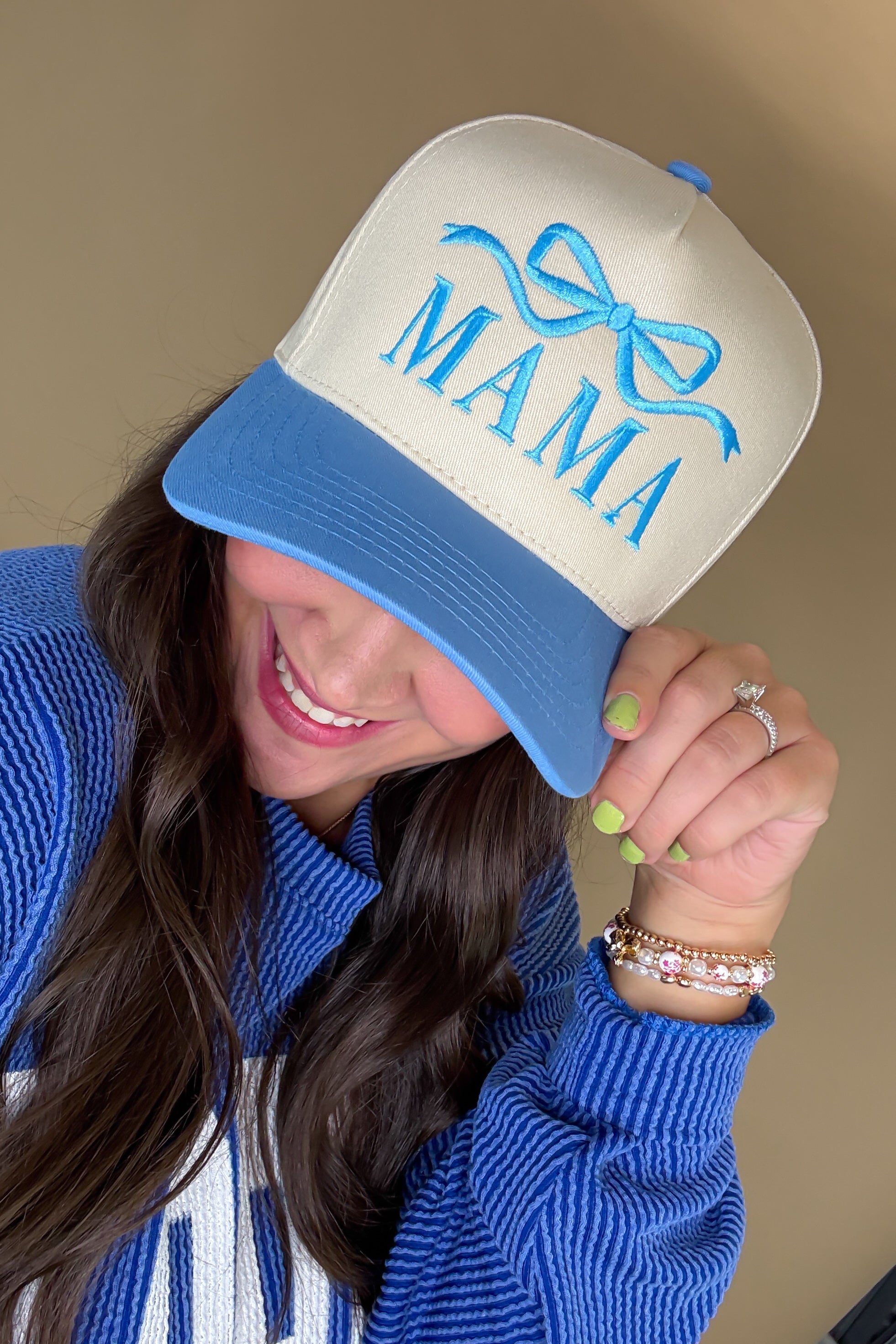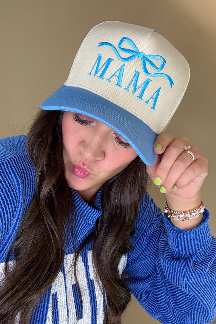 MAMA Bow Embroidered Trucker Hat- Blue