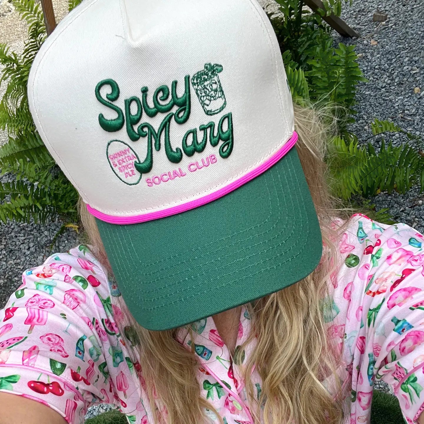 - Green vintage trucker hat with pink rope and side embroidery!