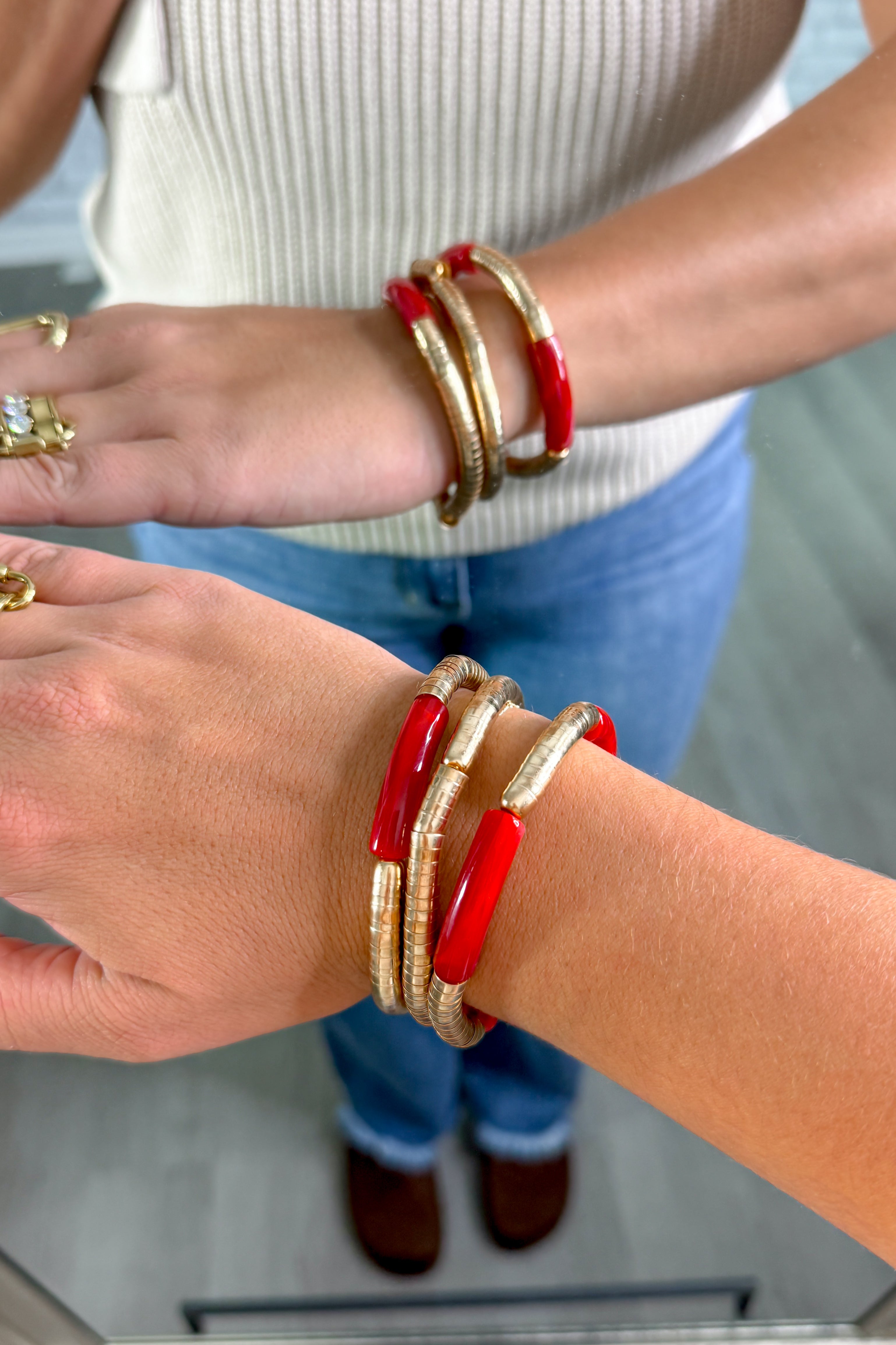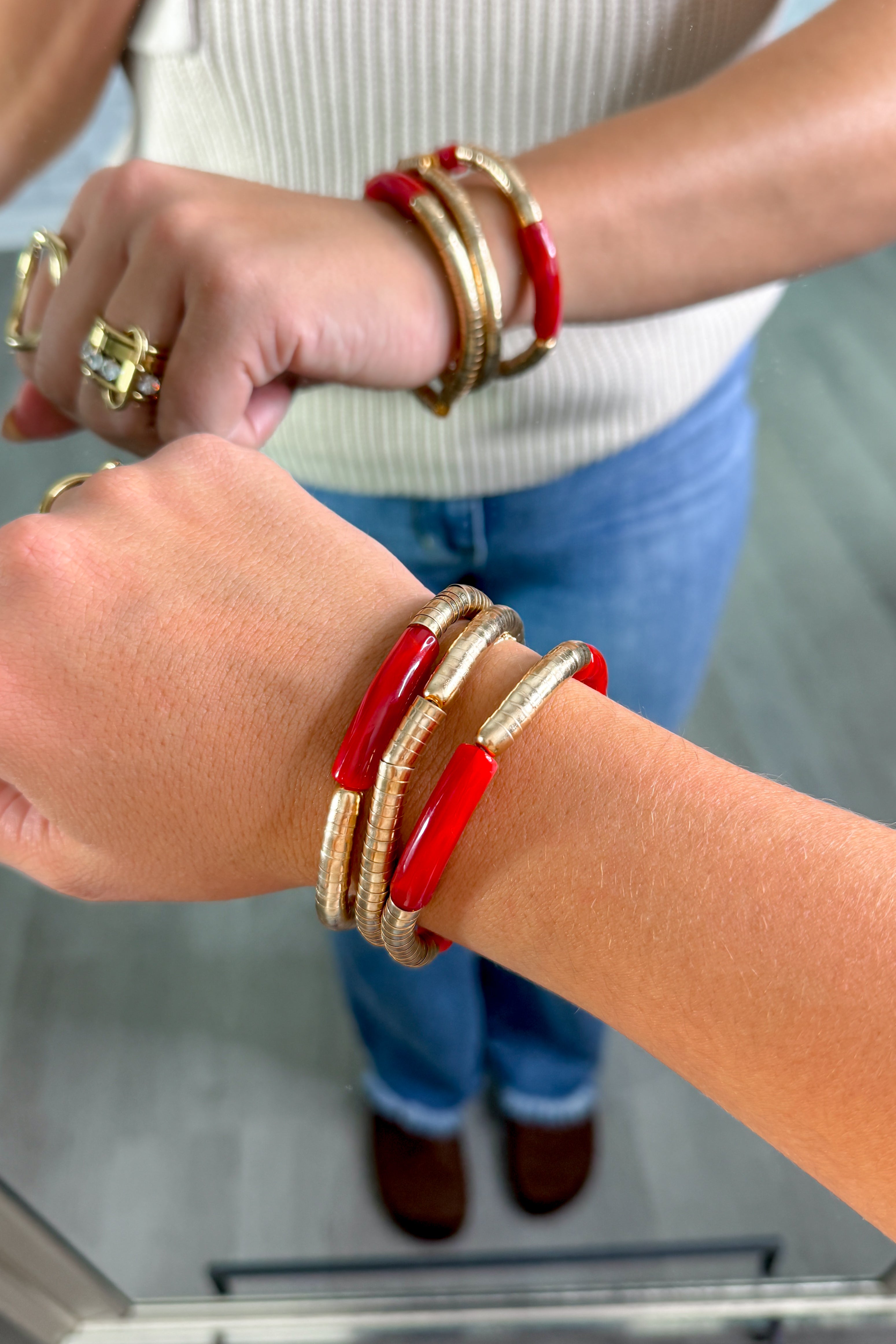 • A modern twist on timeless elegance. These bold bangles features radiant gold plated discs paired with rich maroon resin accents.
