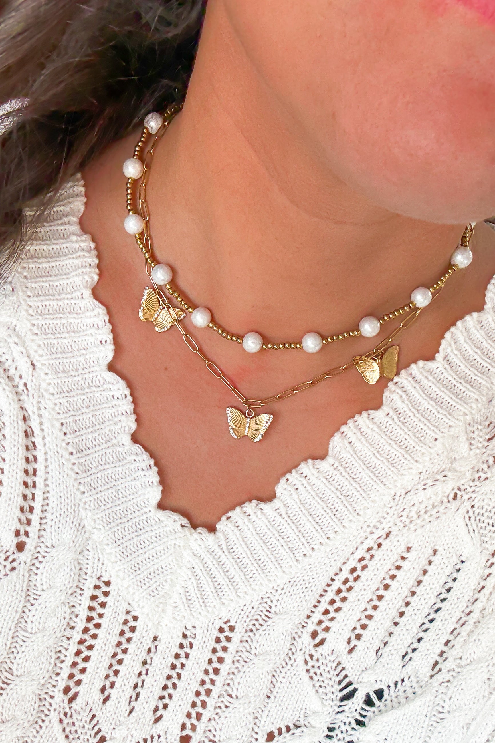 - Shorter Pearl necklace layered in first photo is sold separately