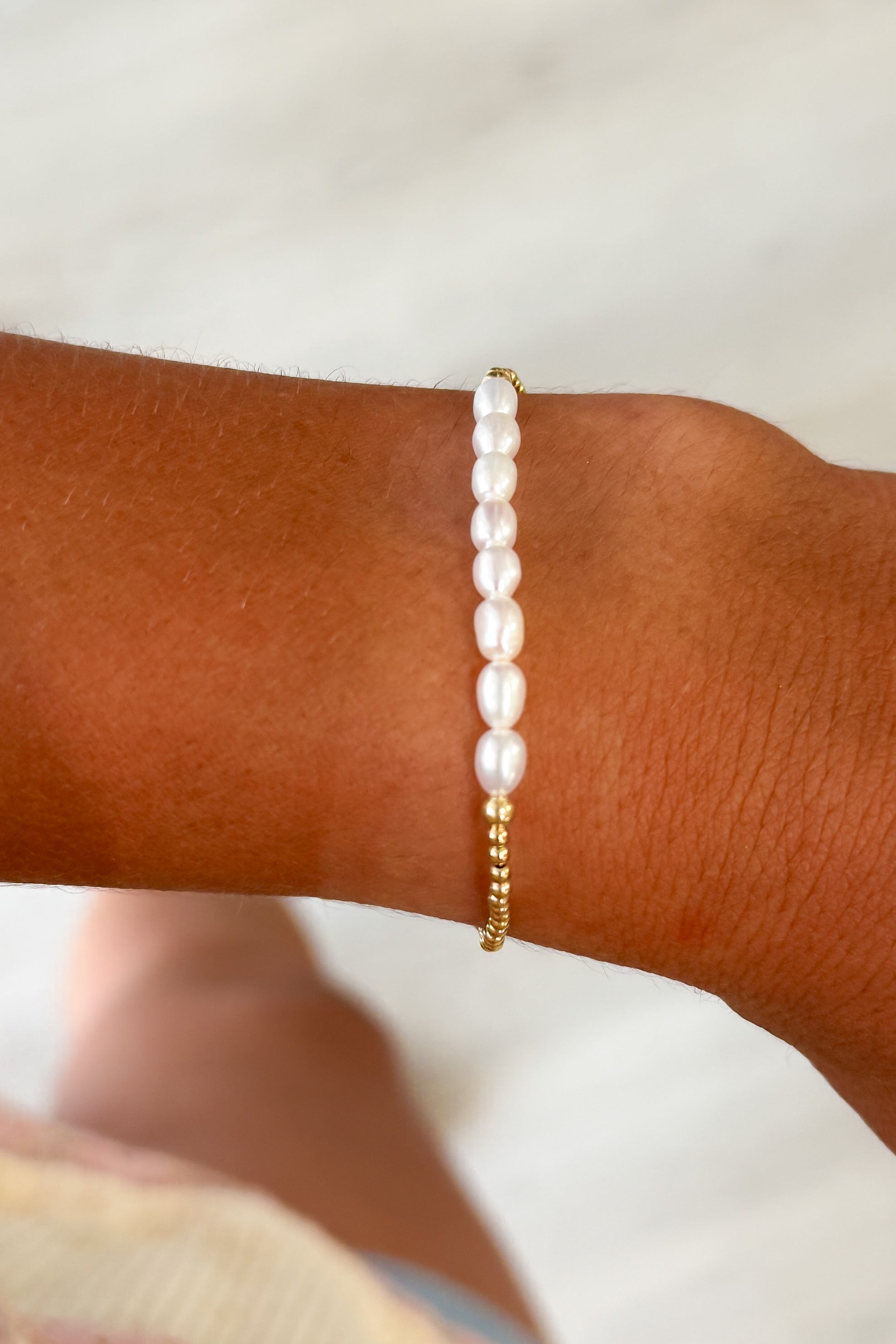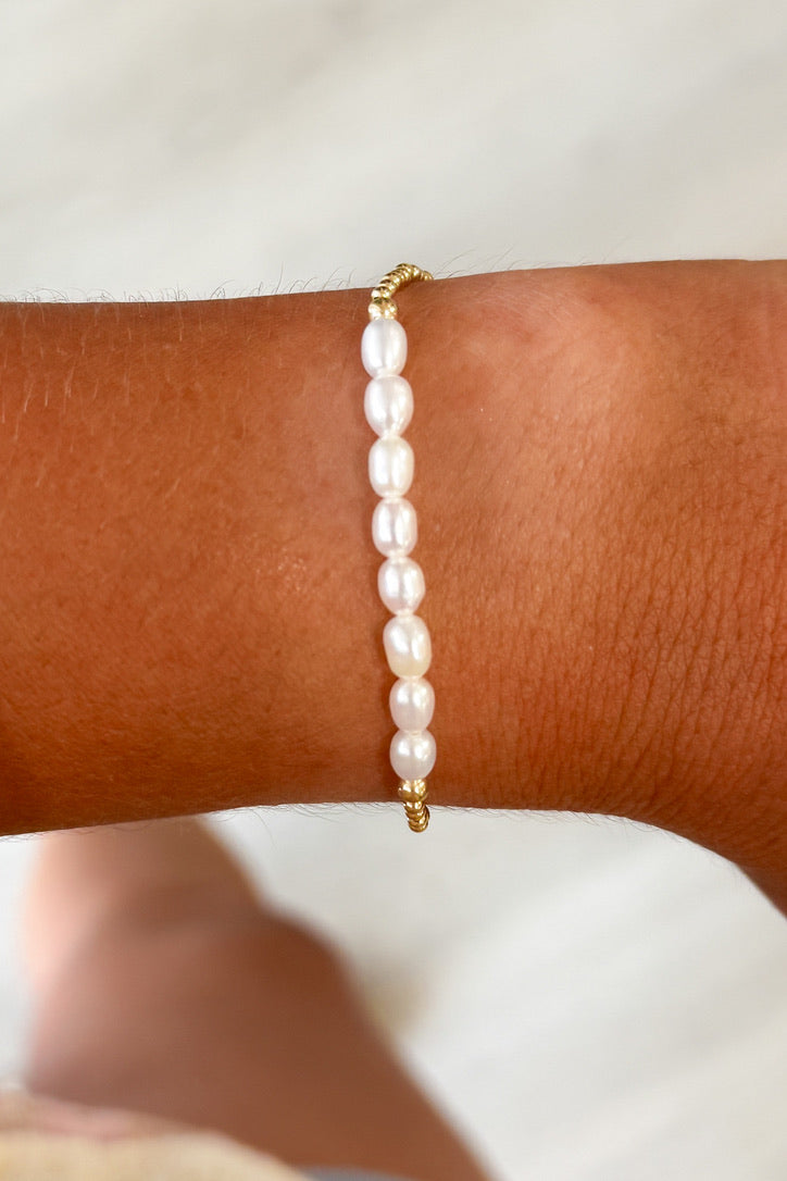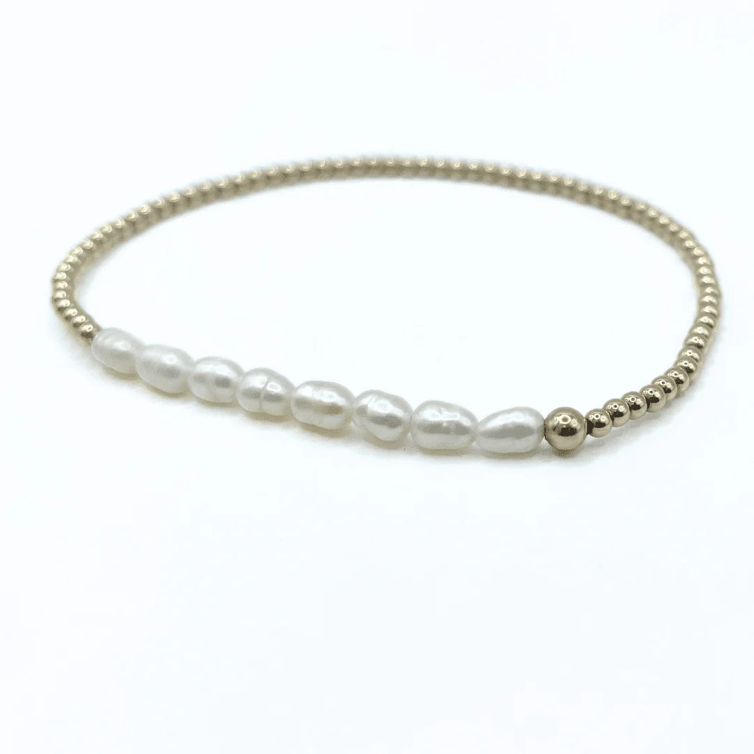 14k gold-filled and waterproof beaded bracelet with a row of natural, fresh-water rice pearls. Sweet, dainty and timeless. Wear single or stack it.