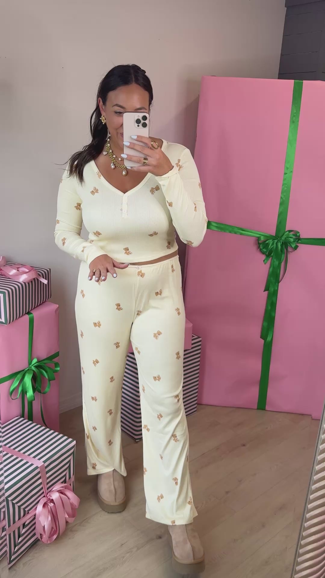 - Relax in style with this playful long sleeve lounge top featuring an adorable teddy bear print. Designed with a button front and soft, lightweight fabric, it’s the perfect mix of comfort and charm.