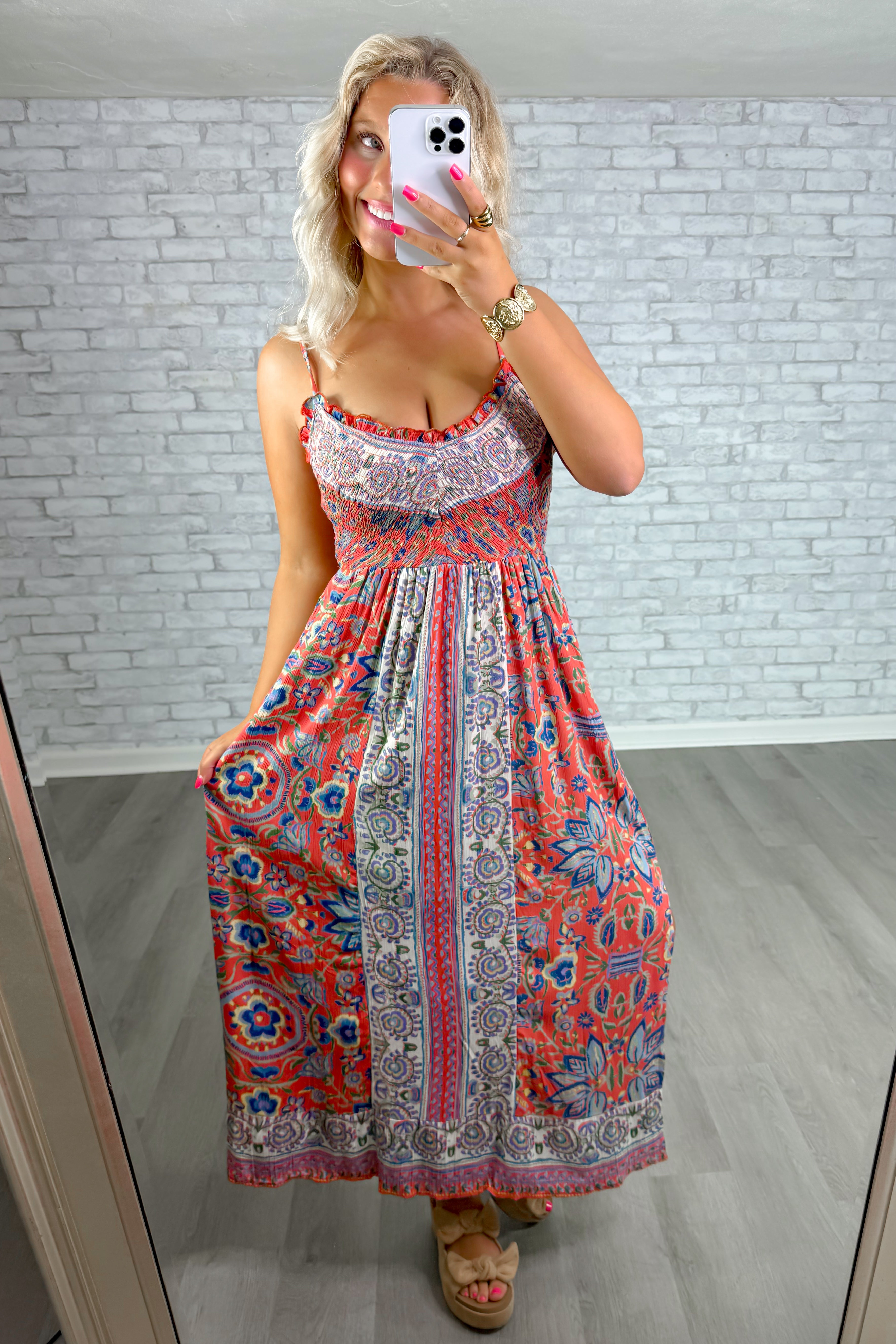 - A bold boho maxi dress with vibrant mixed prints and an effortlessly flowy silhouette.