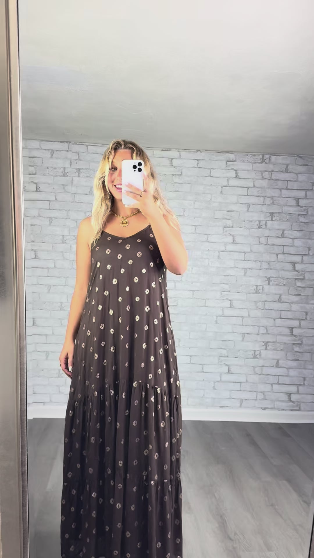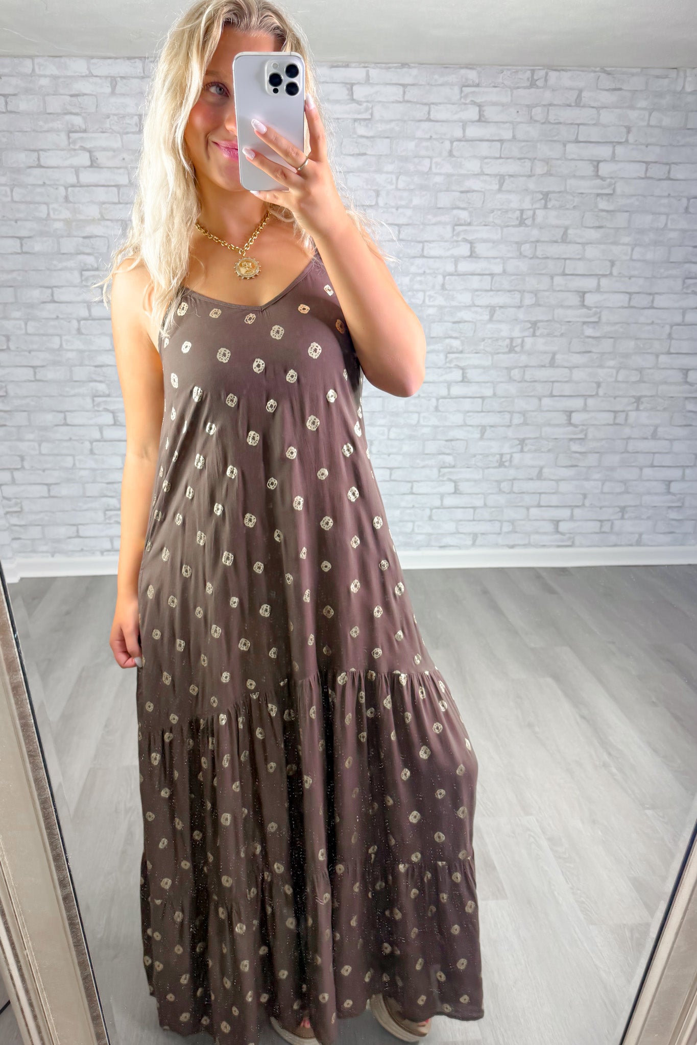 Flowy brown maxi dress with a relaxed tiered silhouette and subtle pattern