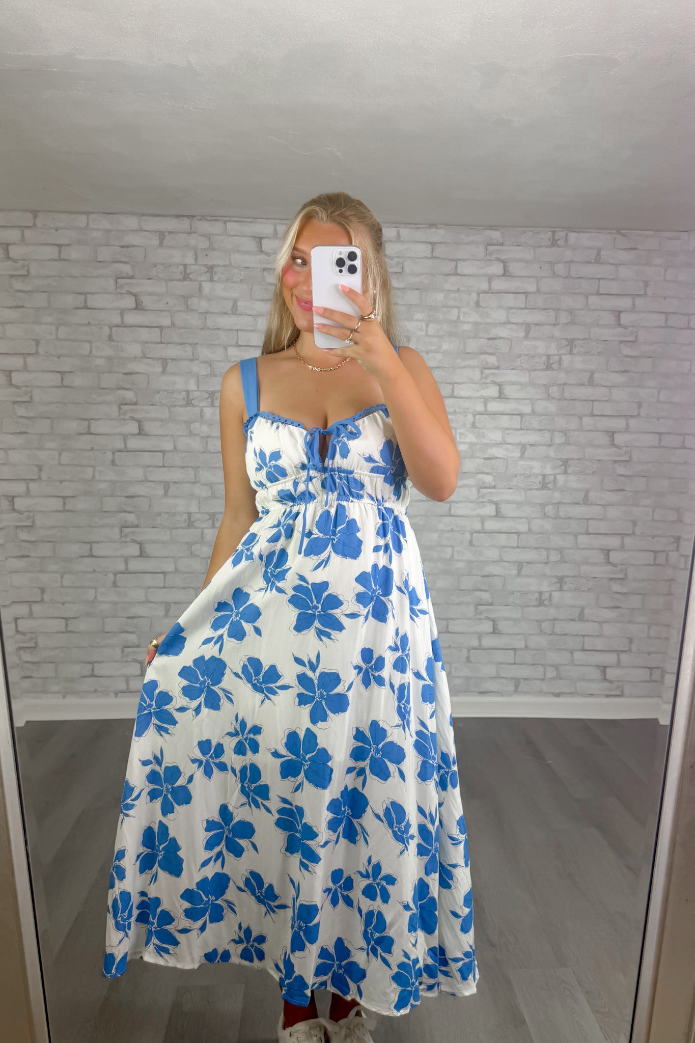 - Fresh white base with bold blue florals and an effortless flowy fit.