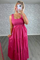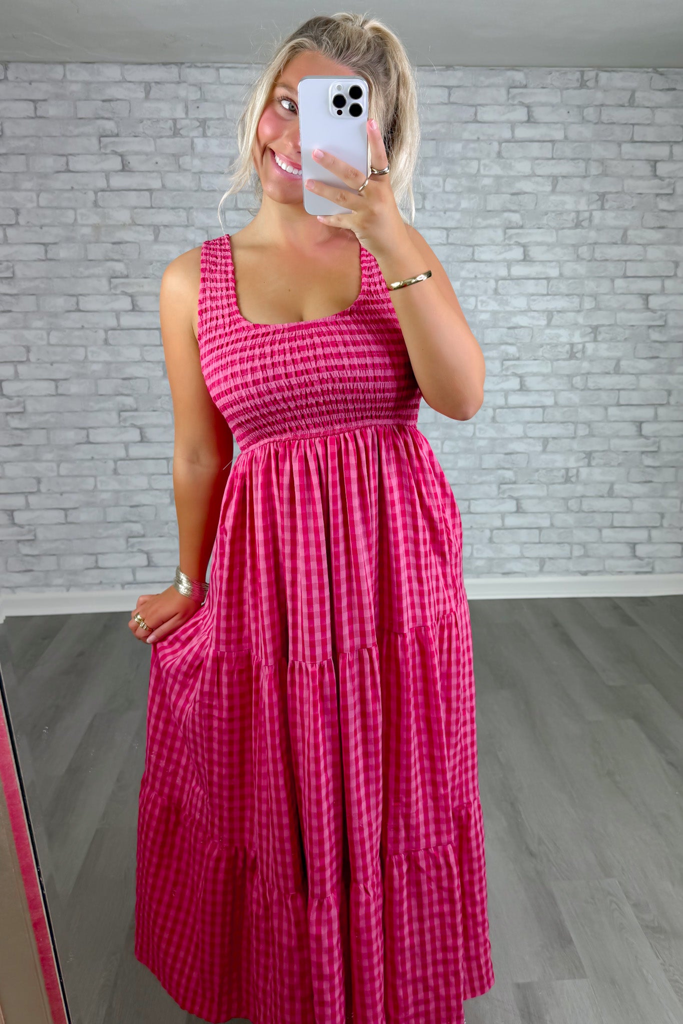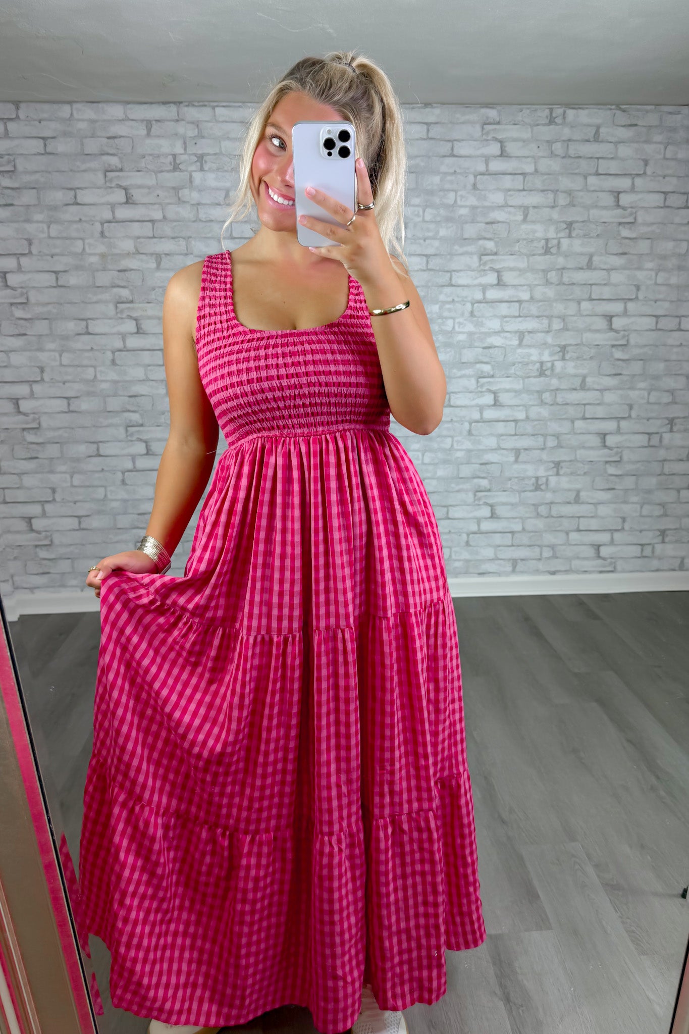 Pink gingham dress with a stretchy smocked bodice and feminine tiered skirt